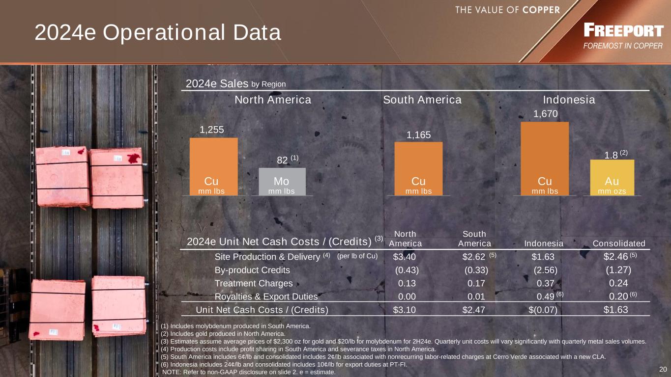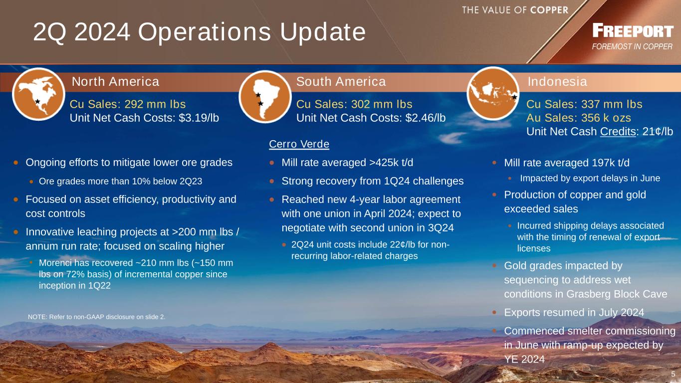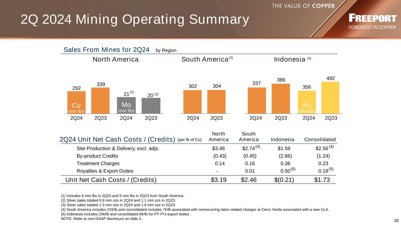 •Second-quarter 2024 consolidated copper and gold sales volumes were impacted by previously announced shipping delays in Indonesia during June 2024