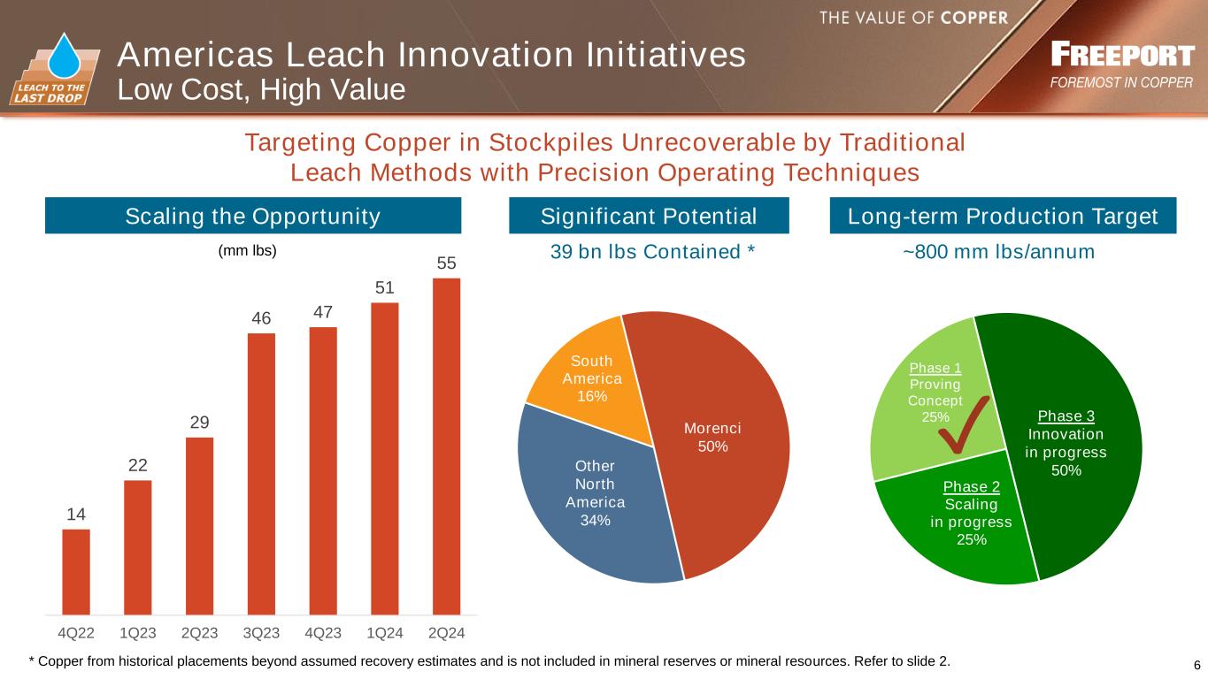 5 2Q 2024 Operations Update North America South America Indonesia Cu Sales: 292 mm lbs Unit Net Cash Costs: $3.19/lb Cu Sales: 302 mm lbs Unit Net Cash Costs: $2.46/lb Cu Sales: 337 mm lbs Au Sales: 356 k ozs Unit Net Cash Credits: 21¢/lb 5 • Ongoing efforts to mitigate lower ore grades • Ore grades more than 10% below 2Q23 • Focused on asset efficiency, productivity and cost controls • Innovative leaching projects at >200 mm lbs / annum run rate; focused on scaling higher • Morenci has recovered ~210 mm lbs (~150 mm lbs on 72% basis) of incremental copper since inception in 1Q22 Cerro Verde • Mill rate averaged >425k t/d • Strong recovery from 1Q24 challenges • Reached new 4-year labor agreement with one union in April 2024; expect to negotiate with second union in 3Q24 • 2Q24 unit costs include 22¢/lb for non- recurring labor-related charges • Mill rate averaged 197k t/d • Impacted by export delays in June • Production of copper and gold exceeded sales • Incurred shipping delays associated with the timing of renewal of export licenses • Gold grades impacted by sequencing to address wet conditions in Grasberg Block Cave • Exports resumed in July 2024 • Commenced smelter commissioning in June with ramp-up expected by YE 2024 NOTE: Refer to non-GAAP disclosure on slide 2.