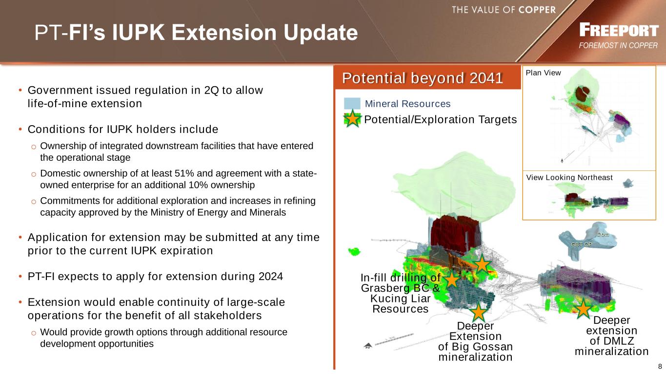7 New Leach Technologies Americas Bagdad Expansion Arizona Grasberg District Indonesia El Abra Expansion Chile Lone Star Expansions Arizona Project Pipeline Progress Report o Sustaining initial target of ~200 mm lbs/yr o High probability of increasing to ~300 – 400 mm lbs/yr in 2026 o Driving innovation toward 800 mm lbs/yr over next 3-5 yrs o Targeting investment decision by YE 2025 with start-up in 2029 o 200 – 250 mm incremental lbs/yr o Derisking in progress with autonomous conversion, tailings infrastructure investment and housing o Commenced pre- feasibility study with expected completion by YE 2025 o Targeting incremental addition of 300 – 400 mm lbs/yr beginning in 2030s o Substantial resource o Kucing Liar project in development - Ramp-up to commence prior to 2030 - 560 mm lbs Cu & 520 k oz Au per annum reflected in base plan o Extension of mining rights beyond 2041 would create opportunities for future growth o Preparing EIS, targeting submission by YE 2025 - 3-yr permitting process - 4-yr construction o Potential start-up in 2033 timeframe o ~750 mm lbs/yr o Potential Reserve adds: ~20 bn lbs ANTICIPATED CAPITAL INVESTMENT <$1 billion Incremental investment $3.5 billion based on recent feasibility Incentive Price: $3.50-$4/lb Developing estimate ~$7.5 billion (under review) ~$4.0 billion for Kucing Liar $0.4 billion incurred to date Excludes $2 bn for extension of leach operations Incentive Price: <$4/lb