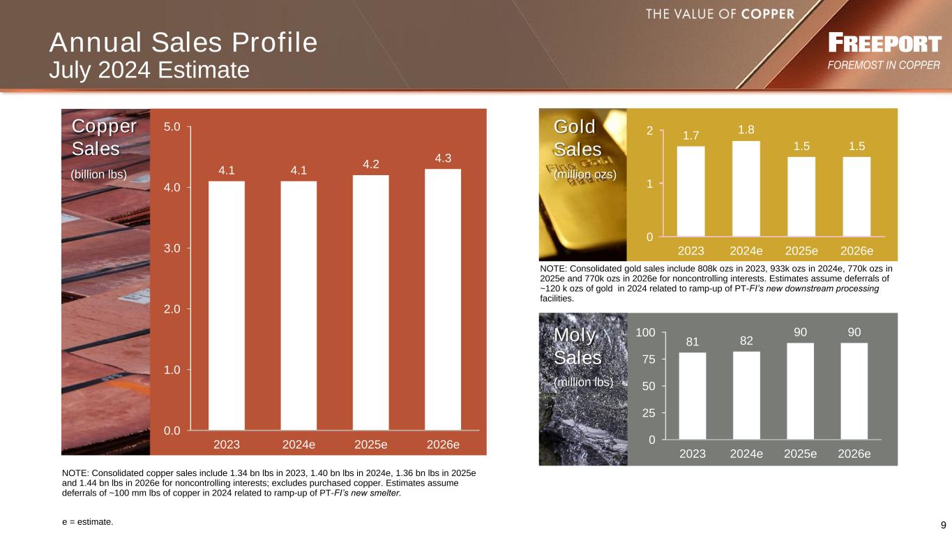 ▪Consolidated sales are expected to approximate 4.1 billion pounds of copper, 1.8 million ounces of gold and 82 million pounds of molybdenum for the year 2024, including 1.0 billion pounds of copper, 475 thousand ounces of gold and 20 million pounds of molybdenum in third-quarter 2024.