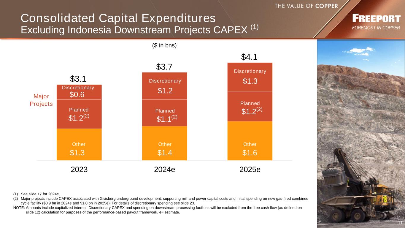 10 NOTE: Refer to non-GAAP disclosure on slide 2. e = estimate. (1) U.S. Dollar Exchange Rates: 920 Chilean peso, 16,250 Indonesian rupiah, $0.66 Australian dollar, $1.08 Euro, 3.72 Peruvian Nuevo Sol base case assumption. Each +10% equals a 10% strengthening of the U.S. dollar; a strengthening of the U.S. dollar against forecasted expenditures in these foreign currencies equates to a cost benefit of noted amounts. $0 $4 $8 $12 $16 Cu $4.00/lb Cu $4.50/lb Cu $5.00/lb Average ’25e/’26e $0 $3 $6 $9 $12 Cu $4.00/lb Cu $4.50/lb Cu $5.00/lb Average ’25e/’26e ($ in bns except copper, gold and molybdenum prices) Operating Cash Flow Excludes working capital changes EBITDA EBITDA and Cash Flow at Various Copper Prices Sensitivities Average ’25e/’26e (US$ in mms) EBITDA Operating Cash Flow Copper +/-$0.10/lb $340 Molybdenum +/-$1.00/lb $ 75 Gold +/-$50/oz $ 50 Currencies (1) +/-10% $155 Diesel +/-10% $ 65 Copper +/-$0.10/lb $430 Molybdenum +/-$1.00/lb $ 80 Gold +/-$50/oz $ 75 Currencies (1) +/-10% $220 Diesel +/-10% $ 95 Assuming $2,300/oz gold, $20/lb molybdenum