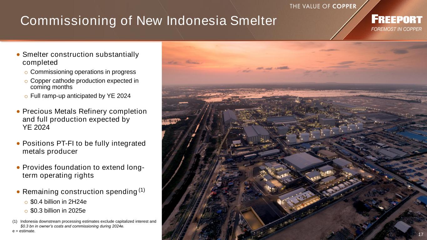 16 2Q 2024 Mining Operating Summary (1) Includes 6 mm lbs in 2Q24 and 5 mm lbs in 2Q23 from South America. (2) Silver sales totaled 0.9 mm ozs in 2Q24 and 1.1 mm ozs in 2Q23. (3) Silver sales totaled 1.3 mm ozs in 2Q24 and 1.8 mm ozs in 2Q23. (4) South America includes 22¢/lb and consolidated includes 7¢/lb associated with nonrecurring labor-related charges at Cerro Verde associated with a new CLA. (5) Indonesia includes 23¢/lb and consolidated 8¢/lb for PT-FI’s export duties. NOTE: Refer to non-GAAP disclosure on slide 2. Site Production & Delivery, excl. adjs. $3.48 $2.74 $1.59 $2.56 By-product Credits (0.43) (0.45) (2.66) (1.24) Treatment Charges 0.14 0.16 0.36 0.23 Royalties & Export Duties - 0.01 0.50 0.18 Unit Net Cash Costs / (Credits) $3.19 $2.46 $(0.21) $1.73 North South America America Indonesia Consolidated(per lb of Cu)2Q24 Unit Net Cash Costs / (Credits) North America 2021 (1) Mo mm lbs 339 292 2Q24 2Q23 Cu mm lbs Indonesia (3) 386 337 492 356 South America 302 304 by Region Au 000 ozs Sales From Mines for 2Q24 2Q24 2Q23 2Q24 2Q23 2Q24 2Q232Q24 2Q23 (2) (5) (1) (4) (4) (5)