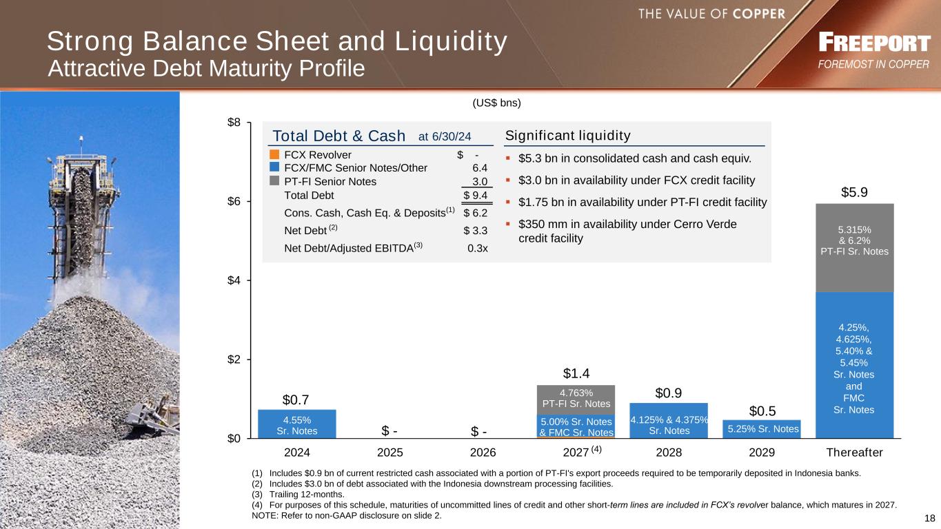 ▪At June 30, 2024, consolidated debt totaled $9.4 billion and consolidated cash and cash equivalents totaled $5.3 billion ($6.2 billion including $0.9 billion of current restricted cash associated with a portion of PT-FI’s export proceeds required to be temporarily deposited in Indonesia banks). Net debt totaled $0.3 billion, excluding $3.0 billion of debt for PT-FI’s new downstream processing facilities. Refer to the supplemental schedule, “Net Debt,” on page IX.