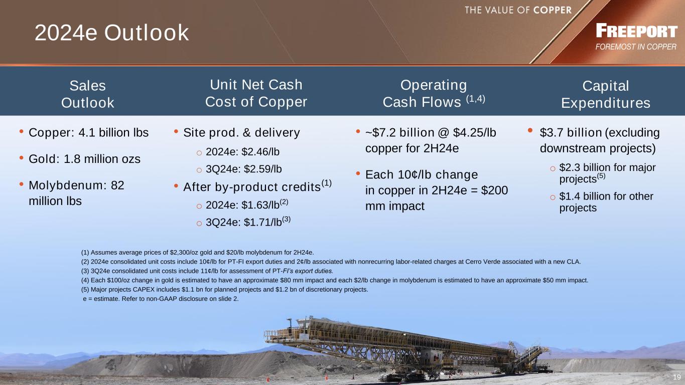▪Operating cash flows totaled $2.0 billion, including $0.1 billion of working capital and other sources, in second-quarter 2024. Operating cash flows are expected to approximate $7.2 billion for the year 2024, based on achievement of current sales volume and cost estimates, and assuming average prices of $4.25 per pound for copper, $2,300 per ounce for gold and $20.00 per pound for molybdenum for the second half of 2024.