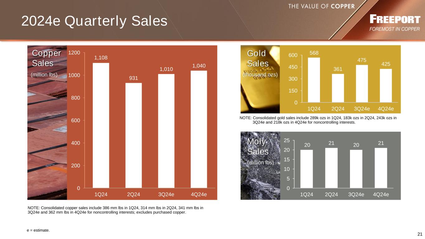 20 (1) (1) Includes molybdenum produced in South America. (2) Includes gold produced in North America. (3) Estimates assume average prices of $2,300 oz for gold and $20/lb for molybdenum for 2H24e. Quarterly unit costs will vary significantly with quarterly metal sales volumes. (4) Production costs include profit sharing in South America and severance taxes in North America. (5) South America includes 6¢/lb and consolidated includes 2¢/lb associated with nonrecurring labor-related charges at Cerro Verde associated with a new CLA. (6) Indonesia includes 24¢/lb and consolidated includes 10¢/lb for export duties at PT-FI. 1,165 82 1,255 1,670 1.8 (2) North America IndonesiaSouth America by Region2024e Sales Mo mm lbs Cu mm lbs Au mm ozs (per lb of Cu)Site Production & Delivery (4) $3.40 $2.62 $1.63 $2.46 By-product Credits (0.43) (0.33) (2.56) (1.27) Treatment Charges 0.13 0.17 0.37 0.24 Royalties & Export Duties 0.00 0.01 0.49 0.20 Unit Net Cash Costs / (Credits) $3.10 $2.47 $(0.07) $1.63 2024e Unit Net Cash Costs / (Credits) (3) North South America America Indonesia Consolidated Cu mm lbs Cu mm lbs NOTE: Refer to non-GAAP disclosure on slide 2. e = estimate. 2024e Operational Data (6) (6) (5)(5)