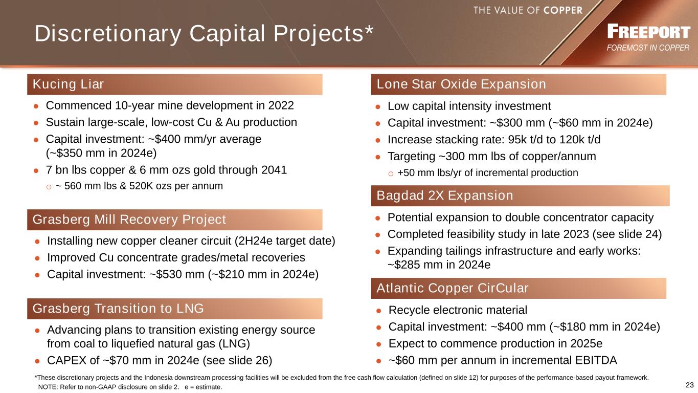 23 Discretionary Capital Projects* ● Commenced 10-year mine development in 2022 ● Sustain large-scale, low-cost Cu & Au production ● Capital investment: ~$400 mm/yr average (~$350 mm in 2024e) ● 7 bn lbs copper & 6 mm ozs gold through 2041 o ~ 560 mm lbs & 520K ozs per annum Kucing Liar ● Recycle electronic material ● Capital investment: ~$400 mm (~$180 mm in 2024e) ● Expect to commence production in 2025e ● ~$60 mm per annum in incremental EBITDA Atlantic Copper CirCular Lone Star Oxide Expansion ● Low capital intensity investment ● Capital investment: ~$300 mm (~$60 mm in 2024e) ● Increase stacking rate: 95k t/d to 120k t/d ● Targeting ~300 mm lbs of copper/annum o +50 mm lbs/yr of incremental production Grasberg Mill Recovery Project ● Installing new copper cleaner circuit (2H24e target date) ● Improved Cu concentrate grades/metal recoveries ● Capital investment: ~$530 mm (~$210 mm in 2024e) *These discretionary projects and the Indonesia downstream processing facilities will be excluded from the free cash flow calculation (defined on slide 12) for purposes of the performance-based payout framework. NOTE: Refer to non-GAAP disclosure on slide 2. e = estimate. ● Potential expansion to double concentrator capacity ● Completed feasibility study in late 2023 (see slide 24) ● Expanding tailings infrastructure and early works: ~$285 mm in 2024e Bagdad 2X Expansion Grasberg Transition to LNG ● Advancing plans to transition existing energy source from coal to liquefied natural gas (LNG) ● CAPEX of ~$70 mm in 2024e (see slide 26)