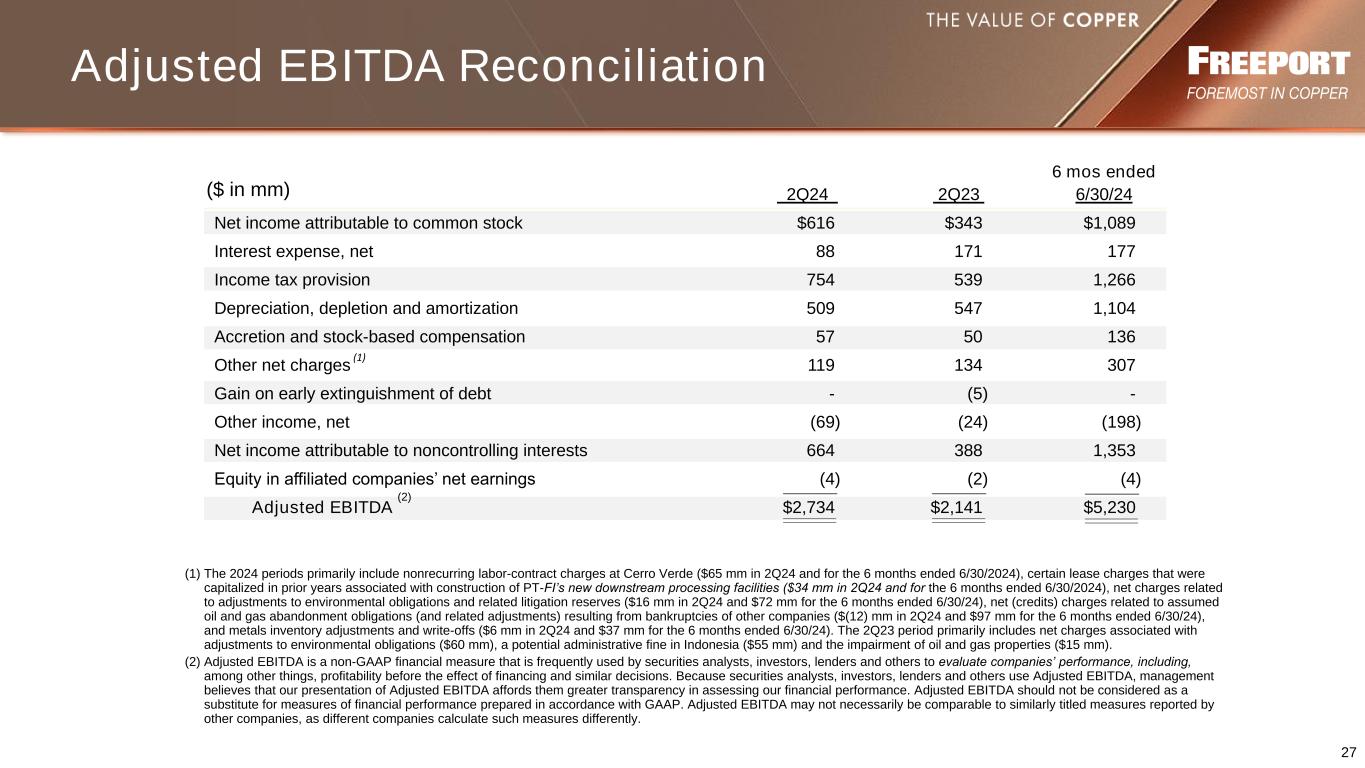 PHOENIX, AZ, July 23, 2024 – Freeport (NYSE: FCX) reported second-quarter 2024 net income attributable to common stock of $616 million, $0.42 per share, and adjusted net income attributable to common stock of $667 million, $0.46 per share, after excluding net charges totaling $51 million, $0.04 per share, primarily associated with nonrecurring labor-contract charges at Cerro Verde and revisions to environmental obligation estimates. For additional information, refer to the supplemental schedule, “Adjusted Net Income,” on page VII.
