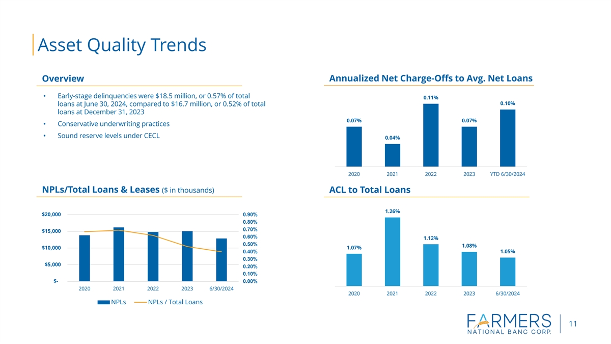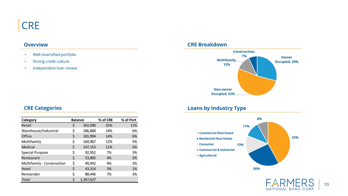 Loan Portfolio Overview Overview Rate Type Segments • Total loans $3.2 billion Variable, 15% • Diverse loan mix • Farmers’ practice is to lend primarily within its market area Fixed, 52% Adjustable, 33% Total Loans (in millions) Net Loans to Assets $3,500.00 66.9% $3,000.00 62.3% 62.1% 58.3% $2,500.00 55.6% $2,000.00 $1,500.00 $1,000.00 $500.00 $0.00 2020 2021 2022 2023 6/30/2024 2020 2021 2022 2023 6/30/2024 CRE C&I Agricultural Residential Mortgage Consumer 9