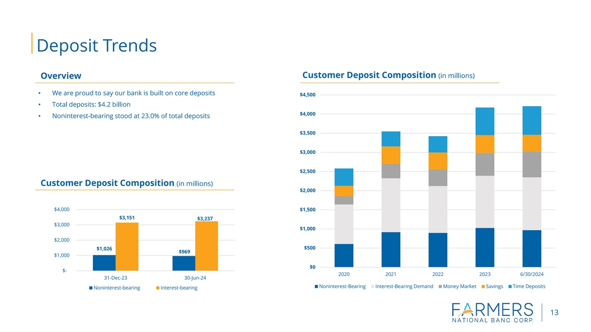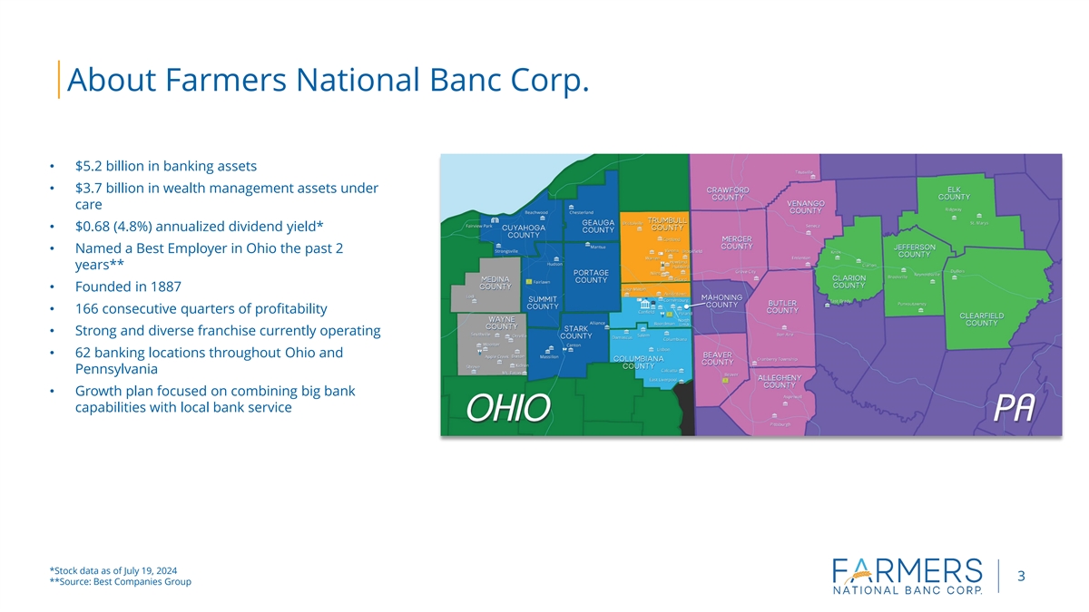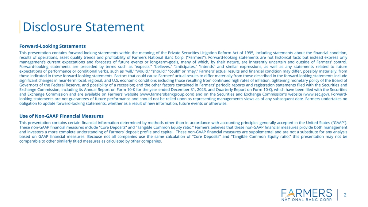 Disclosure Statement Forward-LookingStatements This presentation contains forward-looking statements within the meaning of the Private Securities Litigation Reform Act of 1995, including statements about the financial condition, results of operations, asset quality trends and profitability of Farmers National Banc Corp. (“Farmers”). Forward-looking statements are not historical facts but instead express only management’s current expectations and forecasts of future events or long-term-goals, many of which, by their nature, are inherently uncertain and outside of Farmers’ control. Forward-looking statements are preceded by terms such as “expects,” “believes,” “anticipates,” “intends” and similar expressions, as well as any statements related to future expectations of performance or conditional verbs, such as “will,” “would,” “should,” “could” or “may.” Farmers’ actual results and financial condition may differ, possibly materially, from those indicated in these forward-looking statements. Factors that could cause Farmers’ actual results to differ materially from those described in the forward-looking statements include significant changes in near-term local, regional, and U.S. economic conditions including those resulting from continued high rates of inflation, tightening monetary policy of the Board of Governors of the Federal Reserve, and possibility of a recession; and the other factors contained in Farmers’ periodic reports and registration statements filed with the Securities and Exchange Commission, including its Annual Report on Form 10-K for the year ended December 31, 2023, and Quarterly Report on Form 10-Q, which have been filed with the Securities and Exchange Commission and are available on Farmers’ website (www.farmersbankgroup.com) and on the Securities and Exchange Commission’s website (www.sec.gov). Forward- looking statements are not guarantees of future performance and should not be relied upon as representing management’s views as of any subsequent date. Farmers undertakes no obligation to update forward-looking statements, whether as a result of new information, future events or otherwise. Use of Non-GAAP Financial Measures This presentation contains certain financial information determined by methods other than in accordance with accounting principles generally accepted in the United States (“GAAP”). These non-GAAP financial measures include “Core Deposits” and “Tangible Common Equity ratio.” Farmers believes that these non-GAAP financial measures provide both management and investors a more complete understanding of Farmers’ deposit profile and capital. These non-GAAP financial measures are supplemental and are not a substitute for any analysis based on GAAP financial measures. Because not all companies use the same calculation of “Core Deposits” and “Tangible Common Equity ratio,” this presentation may not be comparable to other similarly titled measures as calculated by other companies. 2