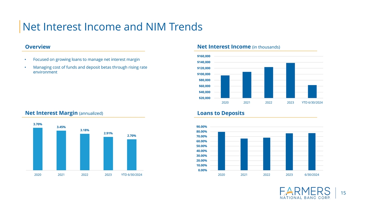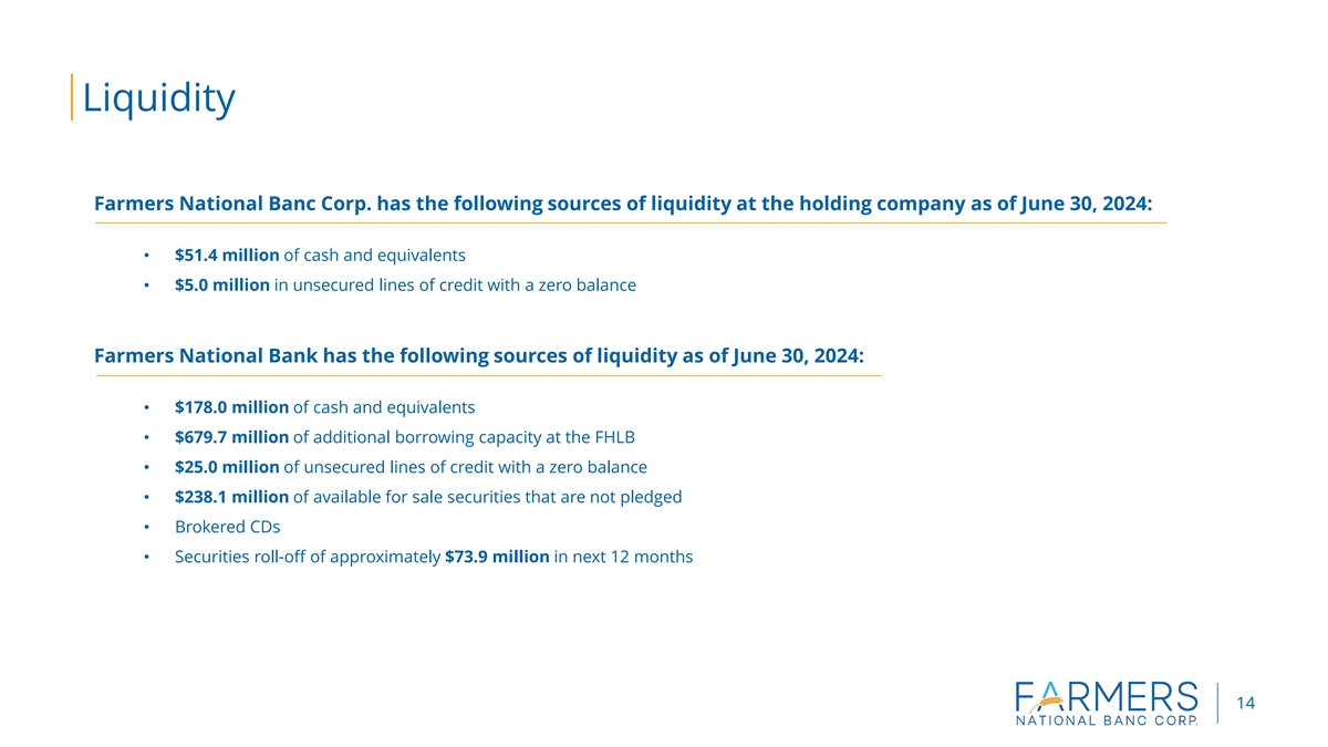 Liquidity Farmers National Banc Corp. has the following sources of liquidity at the holding company as of June 30, 2024: • $51.4 million of cash and equivalents • $5.0 million in unsecured lines of credit with a zero balance Farmers National Bank has the following sources of liquidity as of June 30, 2024: • $178.0 million of cash and equivalents • $679.7 million of additional borrowing capacity at the FHLB • $25.0 million of unsecured lines of credit with a zero balance • $238.1 million of available for sale securities that are not pledged • Brokered CDs • Securities roll-off of approximately $73.9 million in next 12 months 14