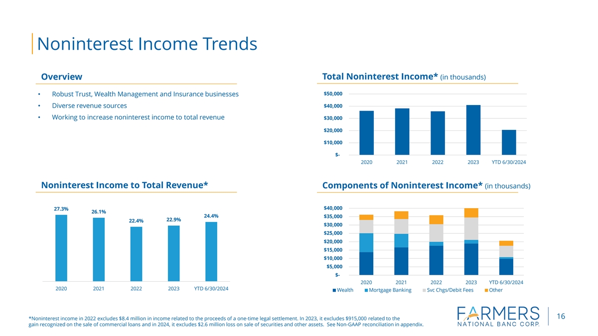 Net Interest Income and NIM Trends Overview Net Interest Income (in thousands) $160,000 • Focused on growing loans to manage net interest margin $140,000 • Managing cost of funds and deposit betas through rising rate $120,000 environment $100,000 $80,000 $60,000 $40,000 $20,000 2020 2021 2022 2023 YTD 6/30/2024 Net Interest Margin (annualized) Loans to Deposits 3.70% 90.00% 3.45% 3.18% 80.00% 2.91% 2.70% 70.00% 60.00% 50.00% 40.00% 30.00% 20.00% 10.00% 0.00% 2020 2021 2022 2023 YTD 6/30/2024 2020 2021 2022 2023 6/30/2024 15