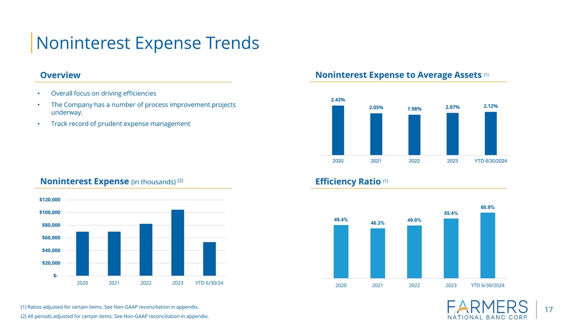 Noninterest Income Trends Overview Total Noninterest Income* (in thousands) $50,000 • Robust Trust, Wealth Management and Insurance businesses $40,000 • Diverse revenue sources • Working to increase noninterest income to total revenue $30,000 $20,000 $10,000 $- 2020 2021 2022 2023 YTD 6/30/2024 Noninterest Income to Total Revenue* Components of Noninterest Income* (in thousands) $40,000 27.3% 26.1% 24.4% $35,000 22.9% 22.4% $30,000 $25,000 $20,000 $15,000 $10,000 $5,000 $- 2020 2021 2022 2023 YTD 6/30/2024 2020 2021 2022 2023 YTD 6/30/2024 Wealth Mortgage Banking Svc Chgs/Debit Fees Other 16 *Noninterest income in 2022 excludes $8.4 million in income related to the proceeds of a one-time legal settlement. In 2023, it excludes $915,000 related to the gain recognized on the sale of commercial loans and in 2024, it excludes $2.6 million loss on sale of securities and other assets. See Non-GAAP reconciliation in appendix.