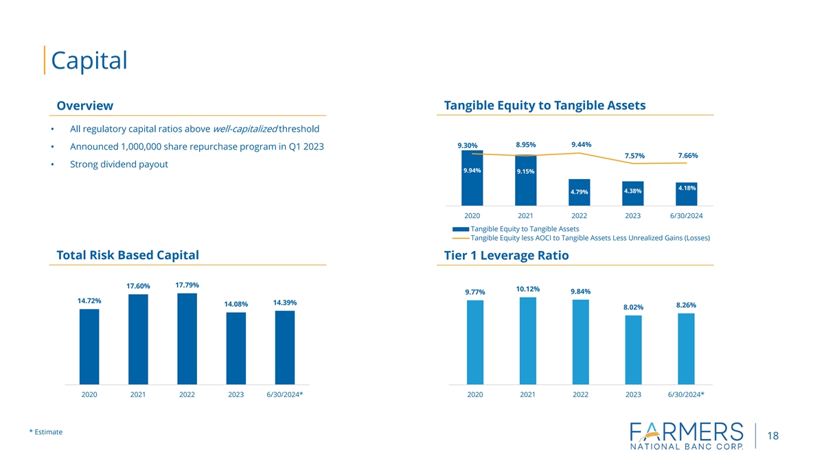 Noninterest Expense Trends 1) (1) Overview Noninterest Expense to Average Assets • Overall focus on driving efficiencies 2.43% • The Company has a number of process improvement projects 2.12% 2.05% 2.07% 1.98% underway. • Track record of prudent expense management 2020 2021 2022 2023 YTD 6/30/2024 (2) (1) Noninterest Expense (in thousands) Efficiency Ratio $120,000 60.9% $100,000 55.4% 49.4% 49.0% 46.3% $80,000 $60,000 $40,000 $20,000 $- 2020 2021 2022 2023 YTD 6/30/24 2020 2021 2022 2023 YTD 6/30/2024 (1) Ratios adjusted for certain items. See Non-GAAP reconciliation in appendix. 17 (2) All periods adjusted for certain items. See Non-GAAP reconciliation in appendix.