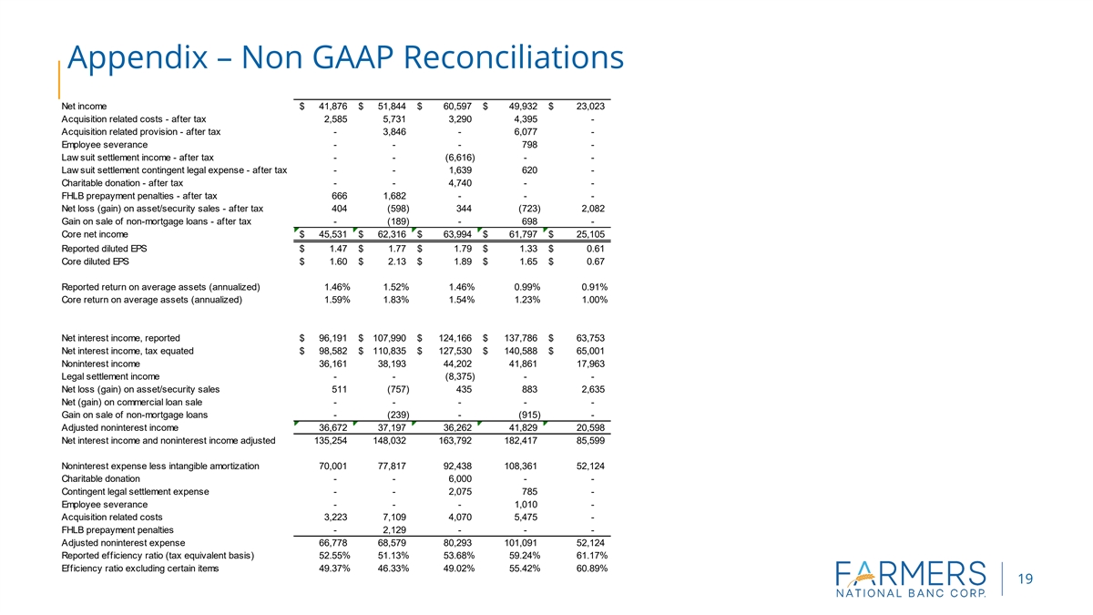 Appendix – Non GAAP Reconciliations Net income $ 41,876 $ 51,844 $ 60,597 $ 49,932 $ 23, 023 Acquisition related costs - after tax 2,585 5,731 3,290 4,395 - Acquisition related provision - after tax - 3,846 - 6,077 - Employee severance - - - 798 - Law suit settlement income - after tax - - ( 6,616) - - Law suit settlement contingent legal expense - after tax - - 1,639 620 - Charitable donation - after tax - - 4,740 - - FHLB prepayment penalties - after tax 666 1,682 - - - Net loss (gain) on asset/security sales - after tax 404 (598) 344 ( 723) 2, 082 Gain on sale of non-mortgage loans - after tax - (189) - 698 - Core net income $ 45,531 $ 62,316 $ 63,994 $ 61,797 $ 25, 105 Reported diluted EPS $ 1.47 $ 1.77 $ 1.79 $ 1.33 $ 0. 61 Core diluted EPS $ 1.60 $ 2.13 $ 1.89 $ 1.65 $ 0. 67 Reported return on average assets (annualized) 1.46% 1.52% 1.46% 0.99% 0.91% Core return on average assets (annualized) 1.59% 1.83% 1.54% 1.23% 1.00% Net interest income, reported $ 96,191 $ 107,990 $ 124,166 $ 137,786 $ 63, 753 Net interest income, tax equated $ 98,582 $ 110,835 $ 127,530 $ 140,588 $ 65, 001 Noninterest income 36,161 38,193 44,202 41,861 17, 963 Legal settlement income - - ( 8,375) - - Net loss (gain) on asset/security sales 511 (757) 435 883 2, 635 Net (gain) on commercial loan sale - - - - - Gain on sale of non-mortgage loans - (239) - ( 915) - Adjusted noninterest income 36,672 37,197 36,262 41,829 20, 598 Net interest income and noninterest income adjusted 135,254 148,032 163,792 182,417 85, 599 Noninterest expense less intangible amortization 70,001 77,817 92,438 108,361 52, 124 Charitable donation - - 6,000 - - Contingent legal settlement expense - - 2,075 785 - Employee severance - - - 1,010 - Acquisition related costs 3,223 7,109 4,070 5,475 - FHLB prepayment penalties - 2,129 - - - Adjusted noninterest expense 66,778 68,579 80,293 101,091 52, 124 Reported efficiency ratio (tax equivalent basis) 52.55% 51.13% 53.68% 59.24% 61.17% Efficiency ratio excluding certain items 49.37% 46.33% 49.02% 55.42% 60.89% 19
