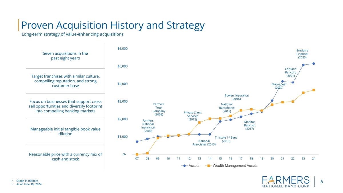 Farmers Strategic Vision Leveraging our History with Modern Banking Technologies to Support our Future Invest in our Franchise Drive Financial Excellence • Leverage technology • Strive for performance metrics in top quartile ranking vs. peer group • Drive efficiencies through Six Sigma operating framework • Focus on growing noninterest income • Strive to be customer centric and provide exceptional experiences • Proactive capital management • Assure Farmers is the best place to work • Maintain financial strength • Continued pursuit of organic and M&A opportunities • Prudent risk management and focus on asset quality 5