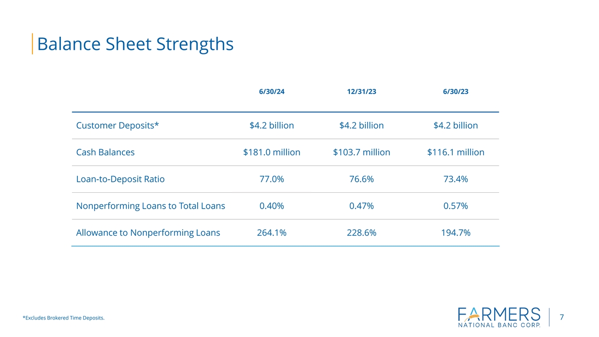 Proven Acquisition History and Strategy Long-term strategy of value-enhancing acquisitions $6,000 Emclaire Seven acquisitions in the Financial (2023) past eight years $5,000 Cortland Bancorp (2021) Target franchises with similar culture, compelling reputation, and strong $4,000 Maple Leaf customer base (2020) Bowers Insurance (2016) $3,000 Focus on businesses that support cross Farmers National sell opportunities and diversify footprint Trust Bancshares into compelling banking markets Company (2015) Private Client (2009) Services $2,000 (2012) Farmers Monitor National Bancorp Insurance (2017) Manageable initial tangible book value (2008) dilution st $1,000 Tri-state 1 Banc National (2015) Associates (2013) $- Reasonable price with a currency mix of 07 08 09 10 11 12 13 14 15 16 17 18 19 20 21 22 23 24 cash and stock Assets Wealth Management Assets • Graph in millions 6 • As of June 30, 2024