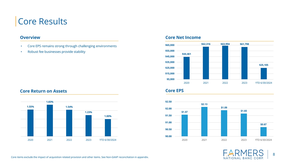 Core Results Overview Core Net Income $62,316 $63,994 $61,798 $65,000 • Core EPS remains strong through challenging environments $55,000 • Robust fee businesses provide stability $44,461 $45,000 $35,000 $25,105 $25,000 $15,000 $5,000 2020 2021 2022 2023 YTD 6/30/2024 Core EPS Core Return on Assets 1.83% $2.50 $2.13 1.55% 1.54% $1.89 $2.00 $1.65 1.23% $1.57 $1.50 1.00% $1.00 $0.67 $0.50 $0.00 2020 2021 2022 2023 YTD 6/30/2024 2020 2021 2022 2023 YTD 6/30/2024 8 Core items exclude the impact of acquisition related provision and other items. See Non-GAAP reconciliation in appendix.