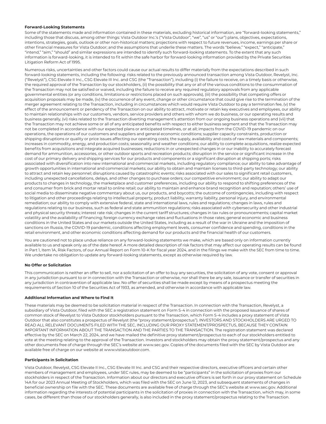 Forward-Looking Statements Some of the statements made and information contained in these materials, excluding historical information, are “forward-looking statements,” including those that discuss, among other things: Vista Outdoor Inc.’s (“Vista Outdoor”, “we”, “us” or “our”) plans, objectives, expectations, intentions, strategies, goals, outlook or other non-historical matters; projections with respect to future revenues, income, earnings per share or other financial measures for Vista Outdoor; and the assumptions that underlie these matters. The words “believe,” “expect,” “anticipate,” “intend,” “aim,” “should” and similar expressions are intended to identify such forward-looking statements. To the extent that any such information is forward-looking, it is intended to fit within the safe harbor for forward-looking information provided by the Private Securities Litigation Reform Act of 1995. Numerous risks, uncertainties and other factors could cause our actual results to differ materially from the expectations described in such forward-looking statements, including the following: risks related to the previously announced transaction among Vista Outdoor, Revelyst, Inc. (“Revelyst”), CSG Elevate II Inc., CSG Elevate III Inc. and CSG (the “Transaction”), including (i) the failure to receive, on a timely basis or otherwise, the required approval of the Transaction by our stockholders, (ii) the possibility that any or all of the various conditions to the consummation of the Transaction may not be satisfied or waived, including the failure to receive any required regulatory approvals from any applicable governmental entities (or any conditions, limitations or restrictions placed on such approvals), (iii) the possibility that competing offers or acquisition proposals may be made, (iv) the occurrence of any event, change or other circumstance that could give rise to the termination of the merger agreement relating to the Transaction, including in circumstances which would require Vista Outdoor to pay a termination fee, (v) the effect of the announcement or pendency of the Transaction on our ability to attract, motivate or retain key executives and employees, our ability to maintain relationships with our customers, vendors, service providers and others with whom we do business, or our operating results and business generally, (vi) risks related to the Transaction diverting management’s attention from our ongoing business operations and (vii) that the Transaction may not achieve some or all of any anticipated benefits with respect to either business segment and that the Transaction may not be completed in accordance with our expected plans or anticipated timelines, or at all; impacts from the COVID-19 pandemic on our operations, the operations of our customers and suppliers and general economic conditions; supplier capacity constraints, production or shipping disruptions or quality or price issues affecting our operating costs; the supply, availability and costs of raw materials and components; increases in commodity, energy, and production costs; seasonality and weather conditions; our ability to complete acquisitions, realize expected benefits from acquisitions and integrate acquired businesses; reductions in or unexpected changes in or our inability to accurately forecast demand for ammunition, accessories, or other outdoor sports and recreation products; disruption in the service or significant increase in the cost of our primary delivery and shipping services for our products and components or a significant disruption at shipping ports; risks associated with diversification into new international and commercial markets, including regulatory compliance; our ability to take advantage of growth opportunities in international and commercial markets; our ability to obtain and maintain licenses to third-party technology; our ability to attract and retain key personnel; disruptions caused by catastrophic events; risks associated with our sales to significant retail customers, including unexpected cancellations, delays, and other changes to purchase orders; our competitive environment; our ability to adapt our products to changes in technology, the marketplace and customer preferences, including our ability to respond to shifting preferences of the end consumer from brick and mortar retail to online retail; our ability to maintain and enhance brand recognition and reputation; others’ use of social media to disseminate negative commentary about us, our products, and boycotts; the outcome of contingencies, including with respect to litigation and other proceedings relating to intellectual property, product liability, warranty liability, personal injury, and environmental remediation; our ability to comply with extensive federal, state and international laws, rules and regulations; changes in laws, rules and regulations relating to our business, such as federal and state ammunition regulations; risks associated with cybersecurity and other industrial and physical security threats; interest rate risk; changes in the current tariff structures; changes in tax rules or pronouncements; capital market volatility and the availability of financing; foreign currency exchange rates and fluctuations in those rates; general economic and business conditions in the United States and our markets outside the United States, including as a result of the war in Ukraine and the imposition of sanctions on Russia, the COVID-19 pandemic, conditions affecting employment levels, consumer confidence and spending, conditions in the retail environment, and other economic conditions affecting demand for our products and the financial health of our customers. You are cautioned not to place undue reliance on any forward-looking statements we make, which are based only on information currently available to us and speak only as of the date hereof. A more detailed descriptio