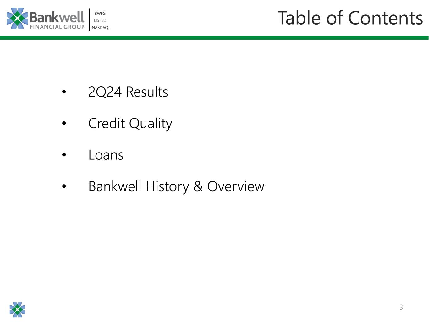 3 BWFG LISTED NASDAQ BWFG LISTED NASDAQ Table of Contents • 2Q24 Results • Credit Quality • Loans • Bankwell History & Overview
