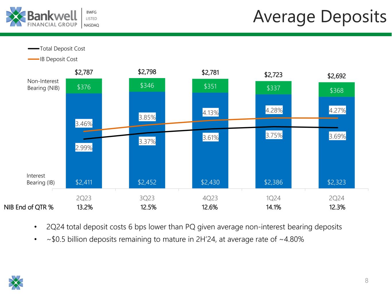 7 BWFG LISTED NASDAQ BWFG LISTED NASDAQ $24.0 $22.7 $22.2 $21.1 $21.2 6.05% 6.15% 6.33% 6.37% 6.37% 2.99% 3.37% 3.61% 3.75% 3.69% $5.0 $7.0 $9.0 $11.0 $13.0 $15.0 $17.0 $19.0 $21.0 $23.0 $25.0 2.00% 3.00% 4.00% 5.00% 6.00% 7.00% 8.00% 2Q23 3Q23 4Q23 1Q24 2Q24 Net Interest Income Loan Yield Cost of Deposits Net Interest Margin Stabilized 1 Includes origination fee amortization 1 NIM 3.07% 2.85% 2.81% 2.71% 2.75% 2Q24 NIM expansion on reduced deposit costs and continued strong loan yields Dollars in millions