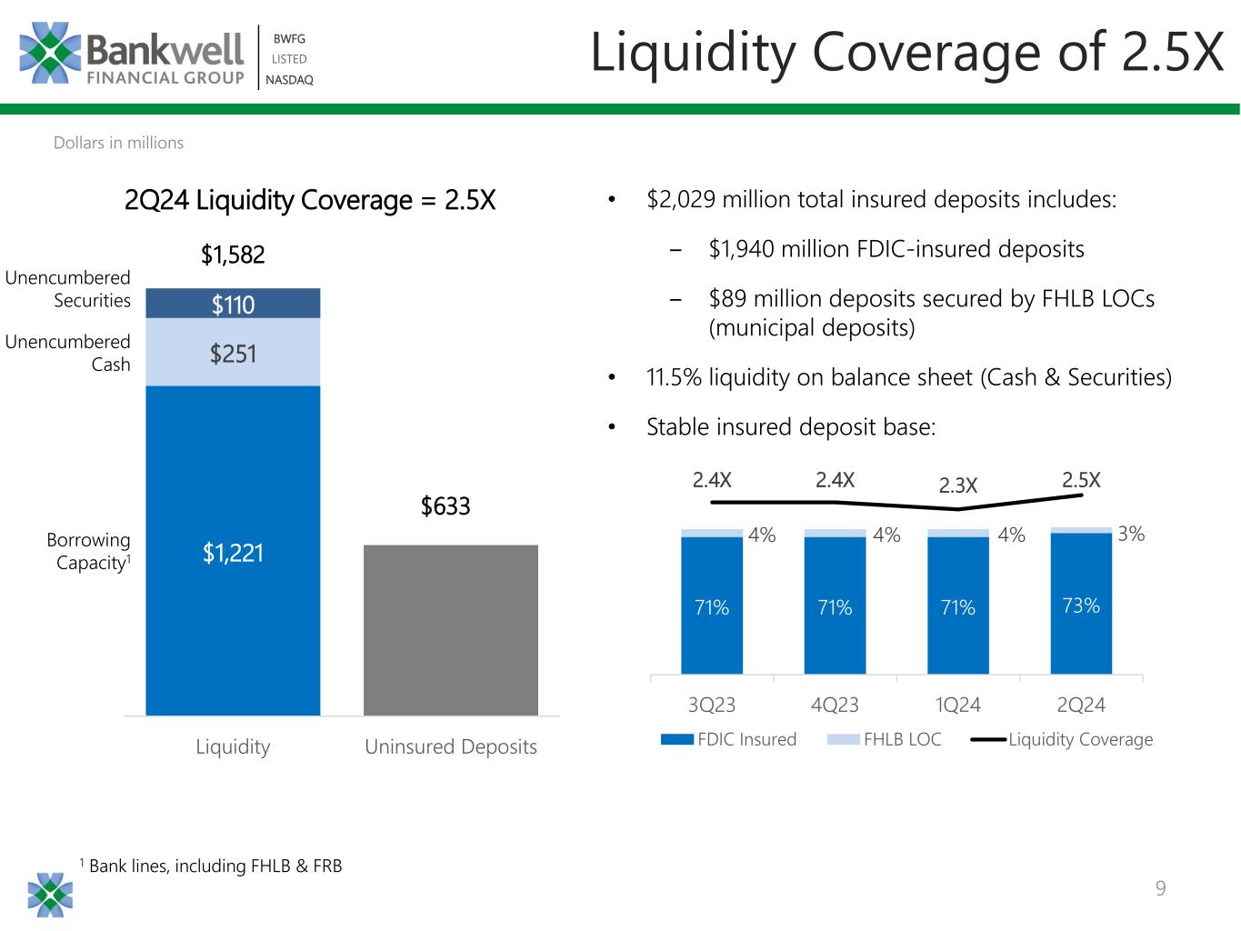 8 BWFG LISTED NASDAQ BWFG LISTED NASDAQ $2,411 $2,452 $2,430 $2,386 $2,323 $376 $346 $351 $337 $368 $2,787 $2,798 $2,781 $2,723 $2,692 2Q23 3Q23 4Q23 1Q24 2Q24 2.99% 3.37% 3.61% 3.75% 3.69% 3.46% 3.85% 4.13% 4.28% 4.27% Total Deposit Cost IB Deposit Cost Average Deposits • 2Q24 total deposit costs 6 bps lower than PQ given average non-interest bearing deposits • ~$0.5 billion deposits remaining to mature in 2H’24, at average rate of ~4.80% NIB End of QTR % 13.2% 12.5% 12.6% 14.1% 12.3% Non-Interest Bearing (NIB) Interest Bearing (IB)