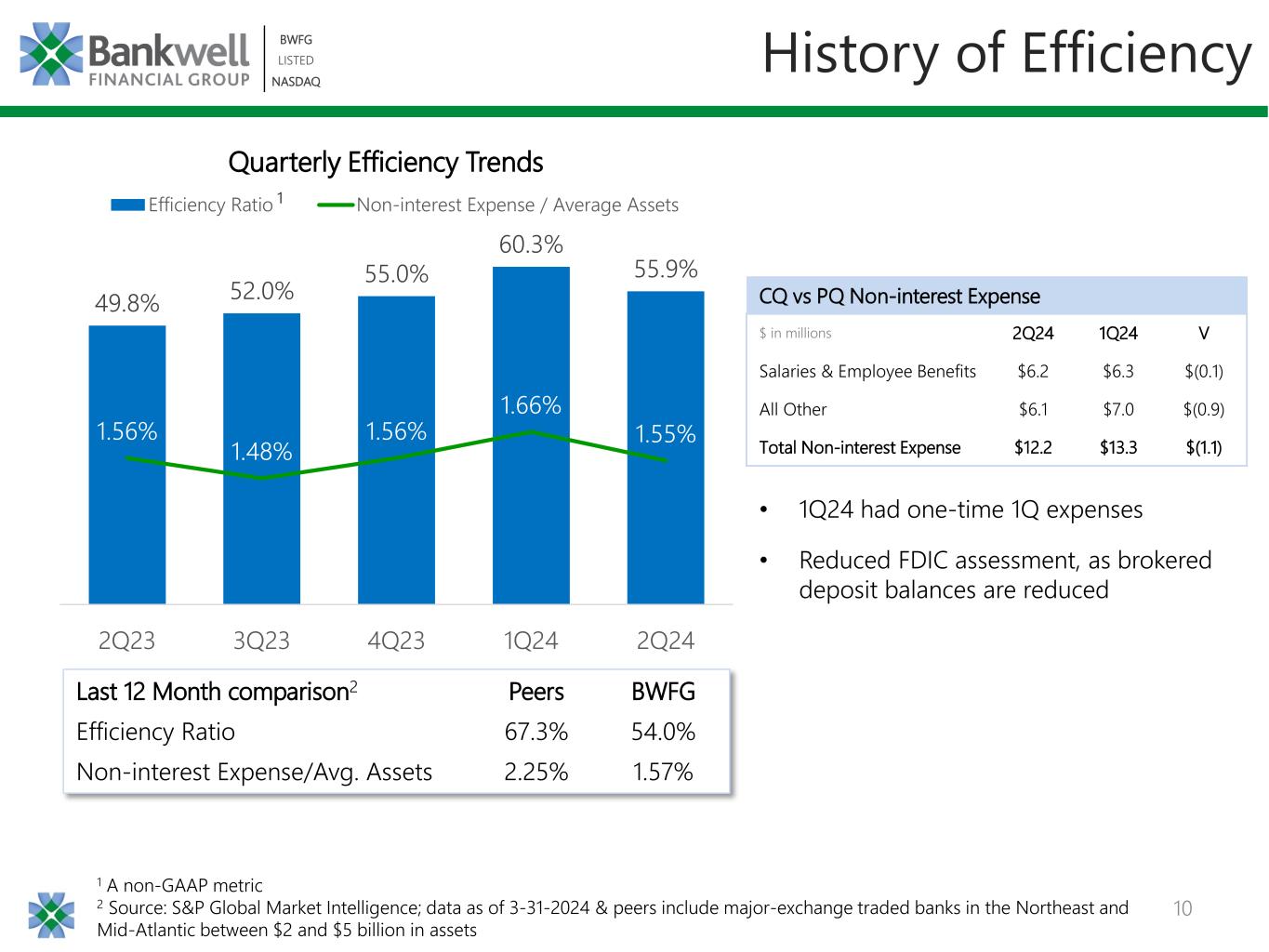 9 BWFG LISTED NASDAQ BWFG LISTED NASDAQ Liquidity Coverage of 2.5X $1,221 $251 $110 Liquidity Uninsured Deposits 2Q24 Liquidity Coverage = 2.5X $1,582 $633 Borrowing Capacity1 Unencumbered Cash Unencumbered Securities 1 Bank lines, including FHLB & FRB 71% 71% 71% 73% 4% 4% 4% 3% 2.4X 2.4X 2.3X 2.5X 0.0X 0.5X 1.0X 1.5X 2.0X 2.5X 0% 10% 20% 30% 40% 50% 60% 70% 80% 90% 100% 3Q23 4Q23 1Q24 2Q24 FDIC Insured FHLB LOC Liquidity Coverage • $2,029 million total insured deposits includes: ‒ $1,940 million FDIC-insured deposits ‒ $89 million deposits secured by FHLB LOCs (municipal deposits) • 11.5% liquidity on balance sheet (Cash & Securities) • Stable insured deposit base: Dollars in millions