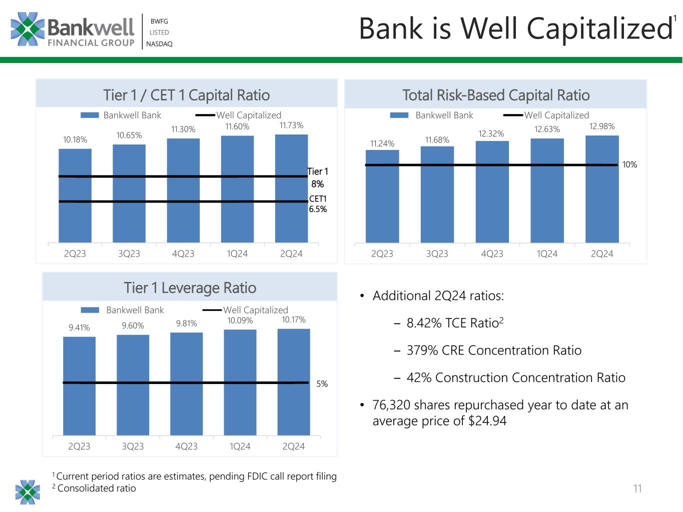 10 BWFG LISTED NASDAQ BWFG LISTED NASDAQ 49.8% 52.0% 55.0% 60.3% 55.9% 1.56% 1.48% 1.56% 1.66% 1.55% 1.00% 1.20% 1.40% 1.60% 1.80% 2.00% 2.20% 2.40% 0.0% 10.0% 20.0% 30.0% 40.0% 50.0% 60.0% 70.0% 2Q23 3Q23 4Q23 1Q24 2Q24 Efficiency Ratio Non-interest Expense / Average Assets 1 A non-GAAP metric 2 Source: S&P Global Market Intelligence; data as of 3-31-2024 & peers include major-exchange traded banks in the Northeast and Mid-Atlantic between $2 and $5 billion in assets 1 History of Efficiency • 1Q24 had one-time 1Q expenses • Reduced FDIC assessment, as brokered deposit balances are reduced Quarterly Efficiency Trends $ in millions 2Q24 1Q24 V Salaries & Employee Benefits $6.2 $6.3 $(0.1) All Other $6.1 $7.0 $(0.9) Total Non-interest Expense $12.2 $13.3 $(1.1) CQ vs PQ Non-interest Expense Last 12 Month comparison2 Peers BWFG Efficiency Ratio 67.3% 54.0% Non-interest Expense/Avg. Assets 2.25% 1.57%