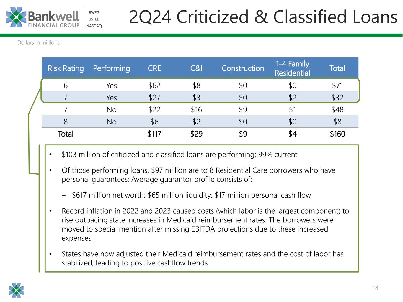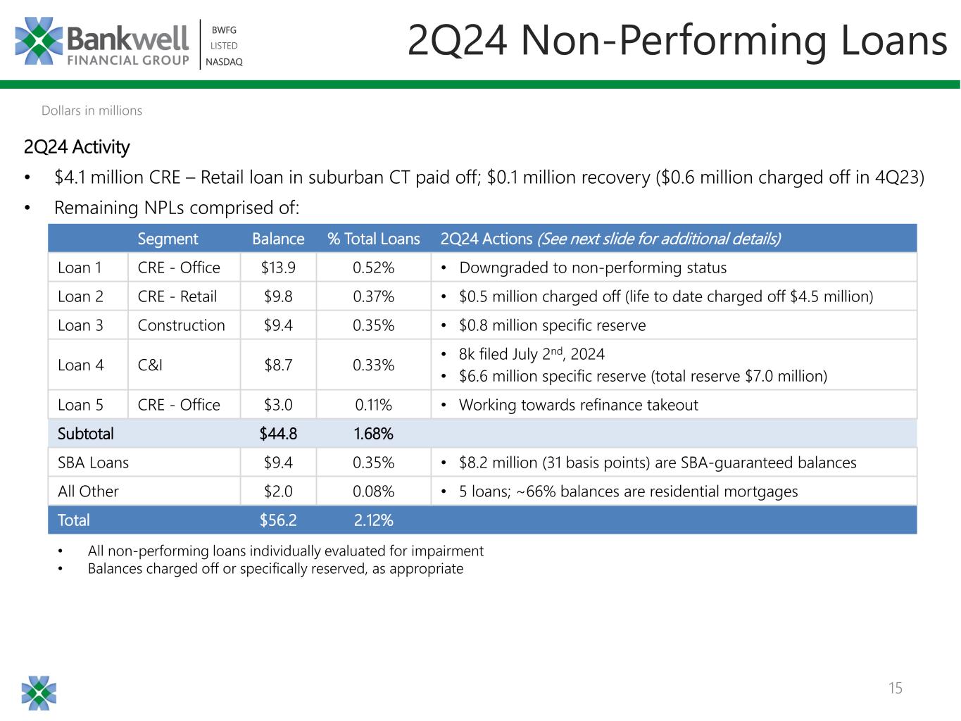 14 BWFG LISTED NASDAQ BWFG LISTED NASDAQ 2Q24 Criticized & Classified Loans Risk Rating Performing CRE C&I Construction 1-4 Family Residential Total 6 Yes $62 $8 $0 $0 $71 7 Yes $27 $3 $0 $2 $32 7 No $22 $16 $9 $1 $48 8 No $6 $2 $0 $0 $8 Total $117 $29 $9 $4 $160 • $103 million of criticized and classified loans are performing; 99% current • Of those performing loans, $97 million are to 8 Residential Care borrowers who have personal guarantees; Average guarantor profile consists of: ‒ $617 million net worth; $65 million liquidity; $17 million personal cash flow • Record inflation in 2022 and 2023 caused costs (which labor is the largest component) to rise outpacing state increases in Medicaid reimbursement rates. The borrowers were moved to special mention after missing EBITDA projections due to these increased expenses • States have now adjusted their Medicaid reimbursement rates and the cost of labor has stabilized, leading to positive cashflow trends Dollars in millions