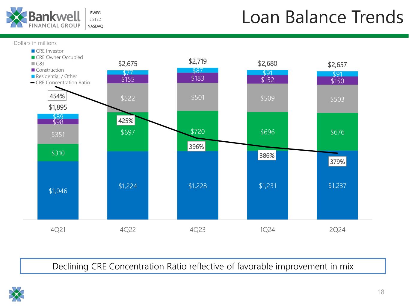 18 BWFG LISTED NASDAQ BWFG LISTED NASDAQ $1,046 $1,224 $1,228 $1,231 $1,237 $310 $697 $720 $696 $676$351 $522 $501 $509 $503 $98 $155 $183 $152 $150 $89 $77 $87 $91 $91 $1,895 $2,675 $2,719 $2,680 $2,657 4Q21 4Q22 4Q23 1Q24 2Q24 CRE Investor CRE Owner Occupied C&I Construction Residential / Other Loan Balance Trends Dollars in millions Declining CRE Concentration Ratio reflective of favorable improvement in mix 454% 425% 396% 386% 379% CRE Concentration Ratio