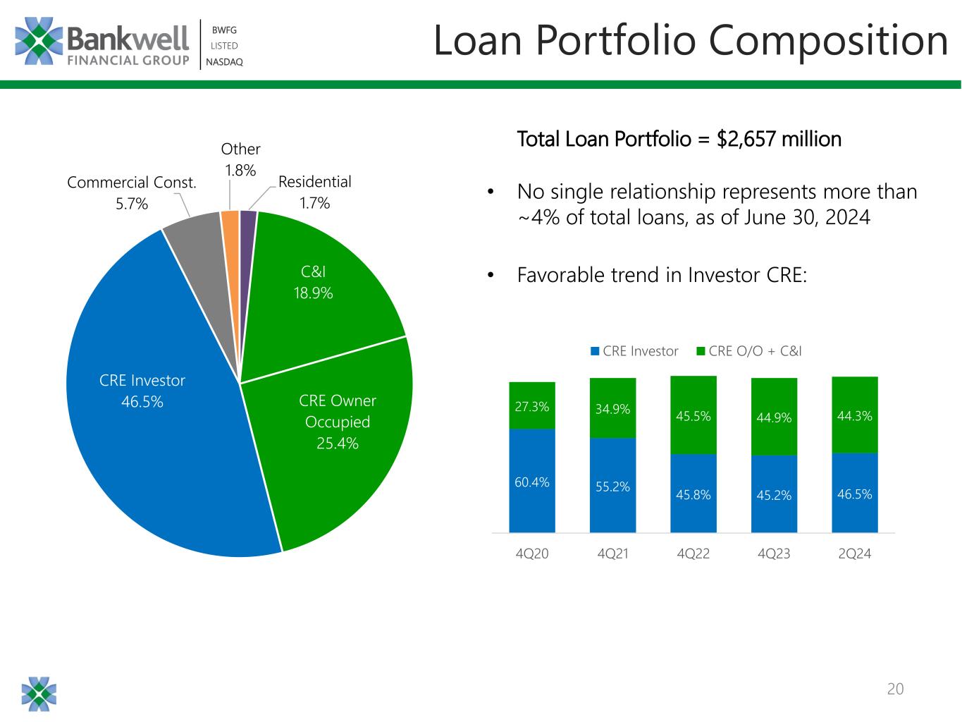 19 BWFG LISTED NASDAQ BWFG LISTED NASDAQ $1,626 $1,895 $2,675 $2,719 $2,657 4.18% 4.30% 5.56% 5.99% 6.05% 0.00% 1.00% 2.00% 3.00% 4.00% 5.00% 6.00% 7.00% - 500 1,000 1,500 2,000 2,500 3,000 3,500 4,000 4Q20 4Q21 4Q22 4Q23 2Q24 Loan Balance Portfolio Loan Yield Loan Yields Steadily Increasing 1 Weighted average yield based on active loans as of each date, an “exit" rate 2 Weighted average yield based on active loans as of 6-30-2024, an “exit" rate 1 Dollars in millions Loan portfolio yields increased 187 bps since 2020 72% of balances are 2021-24 vintages Yields by Vintage2 Loan Maturities & Contractual Repricing Year Maturity Contract Reprice Total % Total Loans 2024 $206 $12 $218 8% 2025 $628 $59 $687 26% 2026 $227 $48 $274 10% 2027+ $812 $97 $909 34% Total $1,872 $216 $2,088 Excluding floating rate loans 5.22% Pre 2021 5.54% 2021 6.36% 2022 7.78% 2023 8.45% 2024