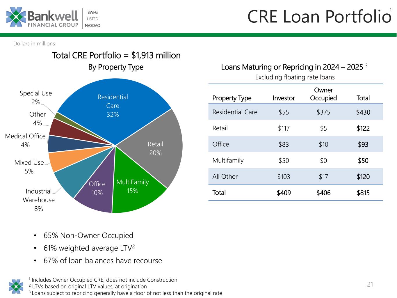 20 BWFG LISTED NASDAQ BWFG LISTED NASDAQ • No single relationship represents more than ~4% of total loans, as of June 30, 2024 • Favorable trend in Investor CRE: Total Loan Portfolio = $2,657 million Loan Portfolio Composition Residential 1.7% C&I 18.9% CRE Owner Occupied 25.4% CRE Investor 46.5% Commercial Const. 5.7% Other 1.8% 60.4% 55.2% 45.8% 45.2% 46.5% 27.3% 34.9% 45.5% 44.9% 44.3% 4Q20 4Q21 4Q22 4Q23 2Q24 CRE Investor CRE O/O + C&I
