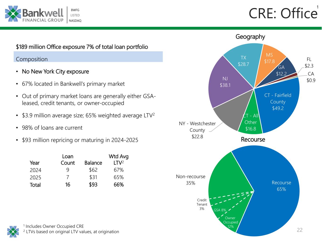 21 BWFG LISTED NASDAQ BWFG LISTED NASDAQ Total CRE Portfolio = $1,913 million 1 Includes Owner Occupied CRE, does not include Construction 2 LTVs based on original LTV values, at origination 3 Loans subject to repricing generally have a floor of not less than the original rate CRE Loan Portfolio • 65% Non-Owner Occupied • 61% weighted average LTV2 • 67% of loan balances have recourse Dollars in millions 1 Property Type Investor Owner Occupied Total Residential Care $55 $375 $430 Retail $117 $5 $122 Office $83 $10 $93 Multifamily $50 $0 $50 All Other $103 $17 $120 Total $409 $406 $815 By Property Type Loans Maturing or Repricing in 2024 – 2025 3 Excluding floating rate loans Residential Care 32% Retail 20% MultiFamily 15% Office 10%Industrial Warehouse 8% Mixed Use 5% Medical Office 4% Other 4% Special Use 2%