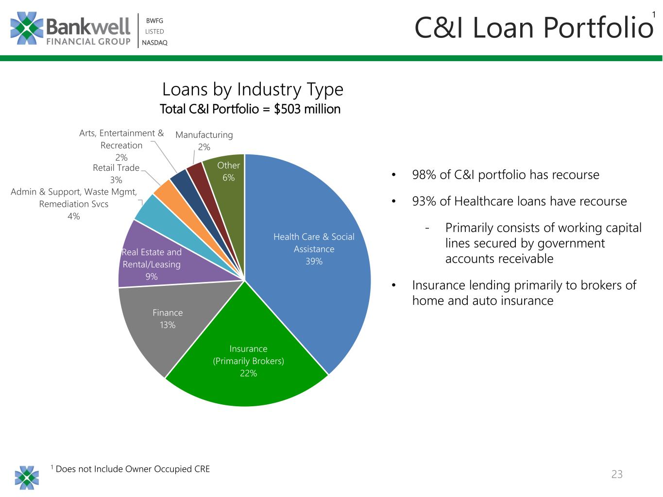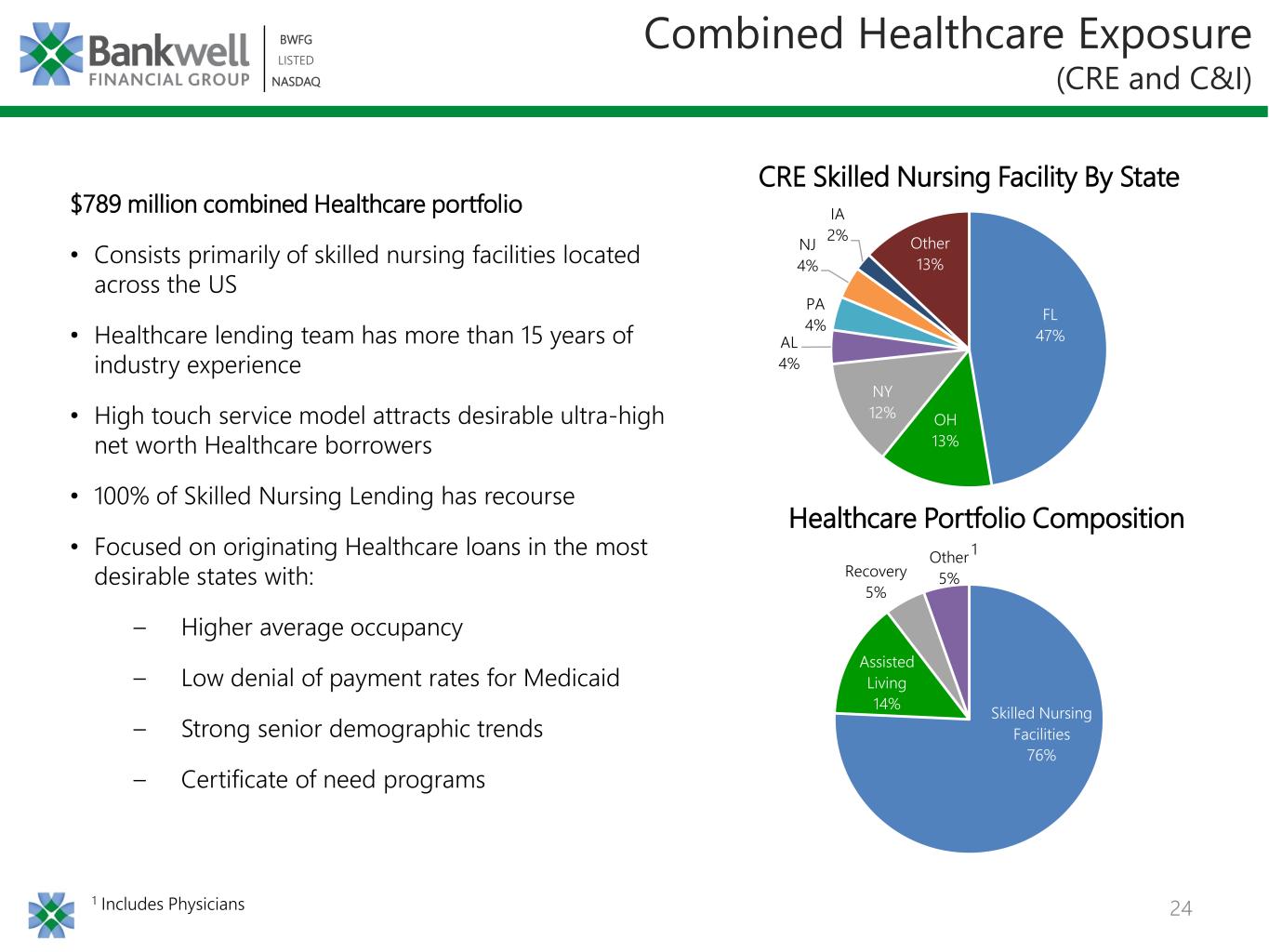 23 BWFG LISTED NASDAQ BWFG LISTED NASDAQ C&I Loan Portfolio Loans by Industry Type Total C&I Portfolio = $503 million 1 Does not Include Owner Occupied CRE 1 • 98% of C&I portfolio has recourse • 93% of Healthcare loans have recourse - Primarily consists of working capital lines secured by government accounts receivable • Insurance lending primarily to brokers of home and auto insurance Health Care & Social Assistance 39% Insurance (Primarily Brokers) 22% Finance 13% Real Estate and Rental/Leasing 9% Admin & Support, Waste Mgmt, Remediation Svcs 4% Retail Trade 3% Arts, Entertainment & Recreation 2% Manufacturing 2% Other 6%
