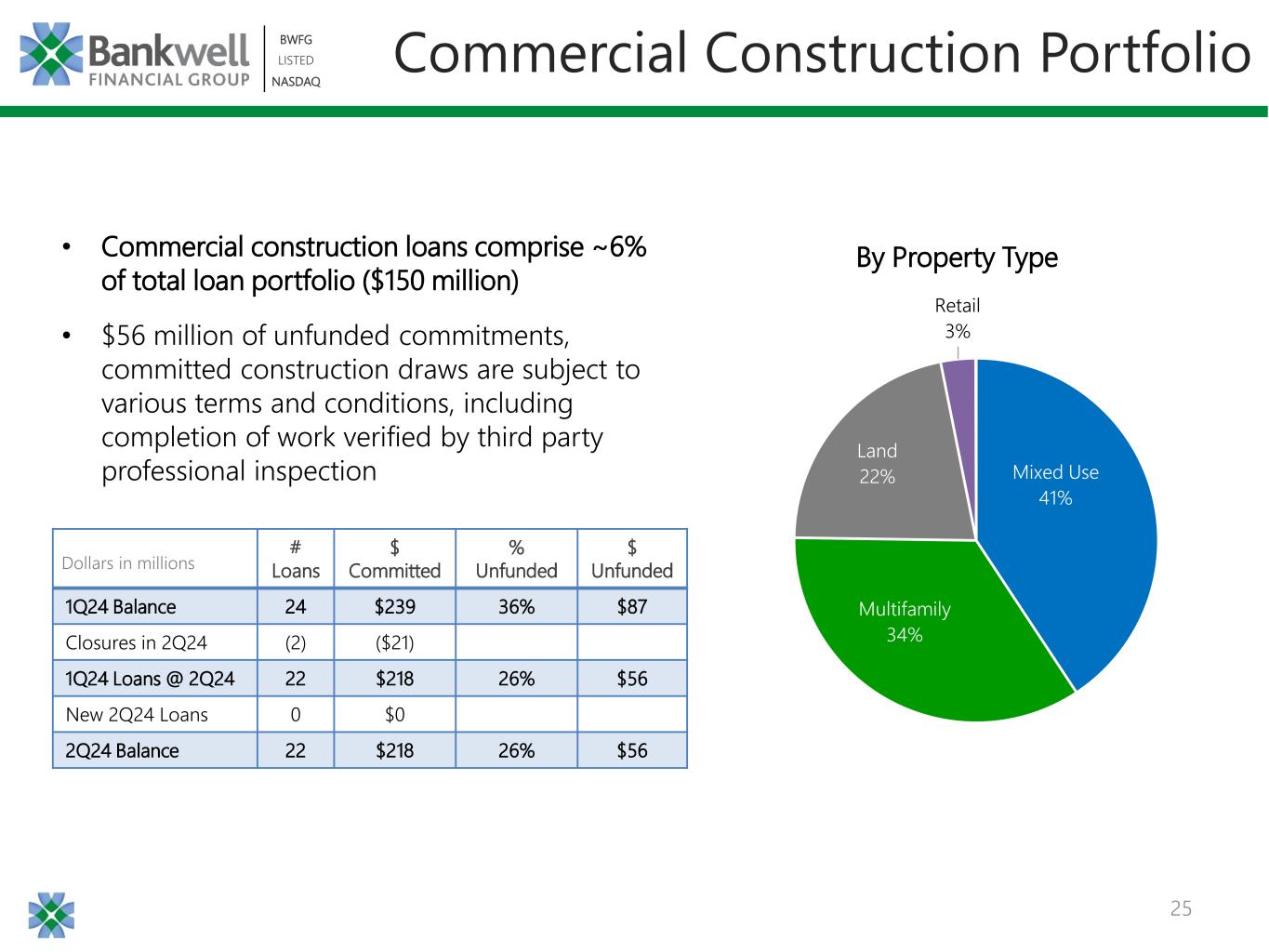 24 BWFG LISTED NASDAQ BWFG LISTED NASDAQ Skilled Nursing Facilities 76% Assisted Living 14% Recovery 5% Other 5% Healthcare Portfolio Composition CRE Skilled Nursing Facility By State 1 Includes Physicians 1 $789 million combined Healthcare portfolio • Consists primarily of skilled nursing facilities located across the US • Healthcare lending team has more than 15 years of industry experience • High touch service model attracts desirable ultra-high net worth Healthcare borrowers • 100% of Skilled Nursing Lending has recourse • Focused on originating Healthcare loans in the most desirable states with: – Higher average occupancy – Low denial of payment rates for Medicaid – Strong senior demographic trends – Certificate of need programs FL 47% OH 13% NY 12% AL 4% PA 4% NJ 4% IA 2% Other 13% Combined Healthcare Exposure (CRE and C&I)