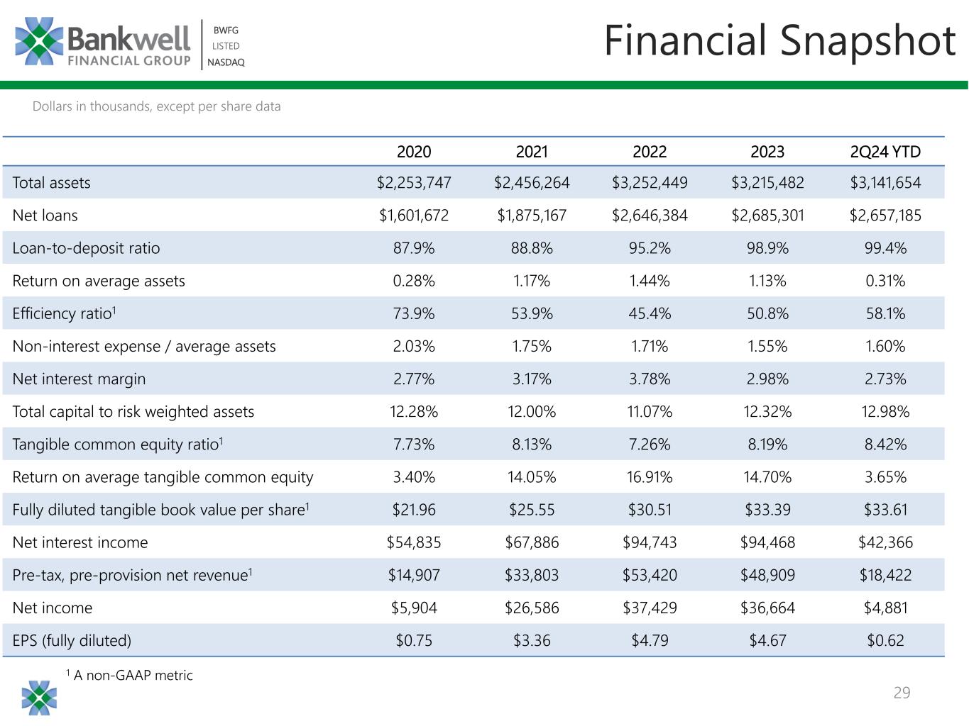 28 BWFG LISTED NASDAQ BWFG LISTED NASDAQ 0.70% 1.49% 2.05% 1.50% 1.16% 2020 2021 2022 2023 2Q24 YTD PPNR Return on Average Assets Performance Trends $0.75 $3.36 $4.79 $4.67 $0.62 2020 2021 2022 2023 2Q24 YTD Diluted EPS 0.28% 1.17% 1.44% 1.13% 0.31% 2020 2021 2022 2023 2Q24 YTD Return on Average Assets 3.40% 14.05% 16.91% 14.70% 3.65% 2020 2021 2022 2023 2Q24 YTD Return on Average Tangible Common Equity 1 Pre-tax, pre-provision net revenue is a non-GAAP metric & excludes provision for loan losses and income tax expense 1