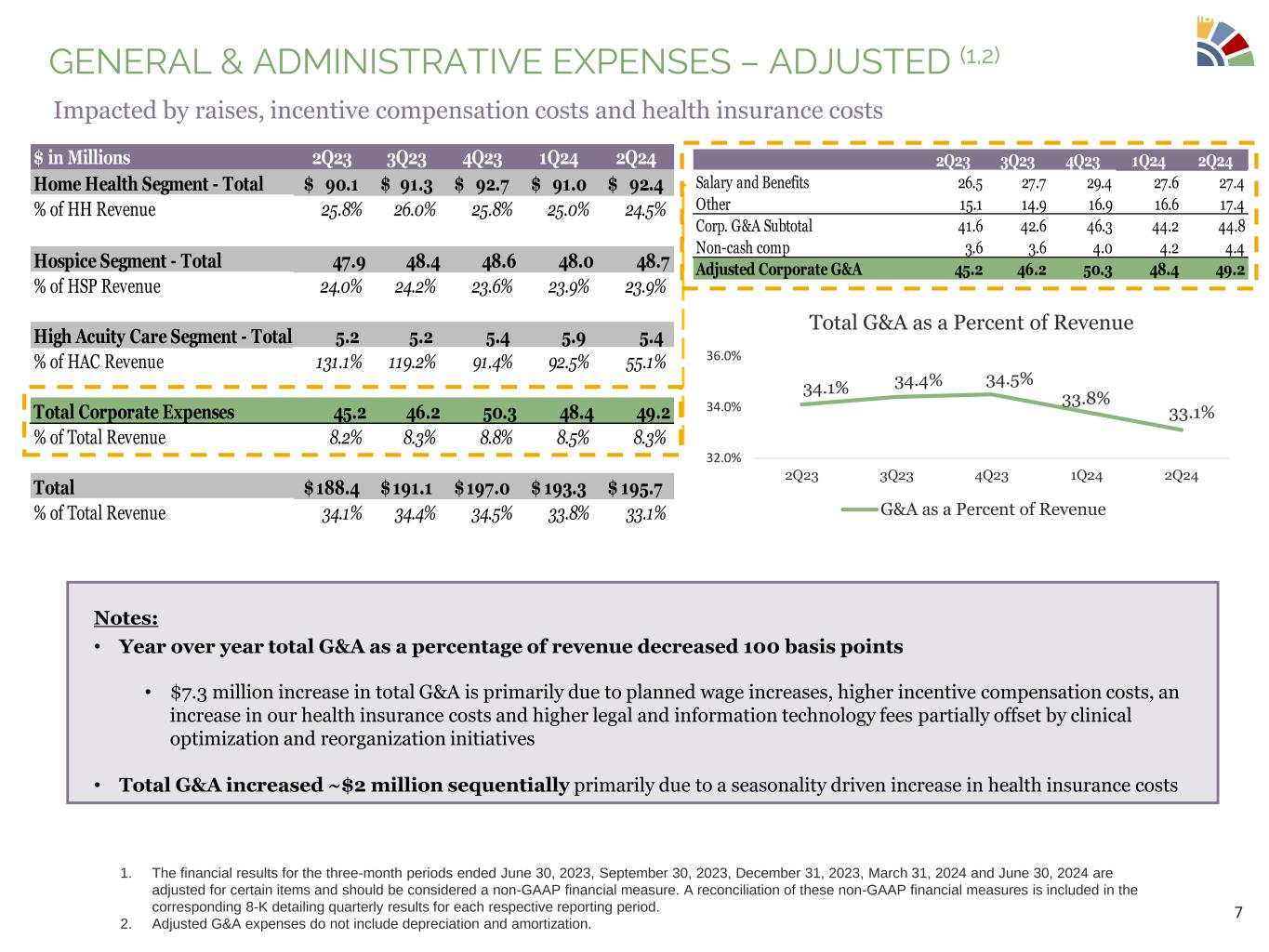 6 HOME HEALTH AND HOSPICE SEGMENT (ADJUSTED) – Q2 2024(1) • Medicare revenue per episode up 1.0% primarily due to the rate increase effective 1/1/2024. • Y/Y Total CPV up $6.79 (+6.2%) primarily due to raises, wage inflation, an increase in new hire pay and higher health insurance costs. • EBITDA margin decreased 40 basis points driven by a shift in our payor mix and higher labor costs. Home Health Highlights • Net revenue per day +2.0% primarily due to the +3.1% Hospice rate update effective 10/1/2023 partially offset by patient mix. • Cost per day up $4.47 (+5.3%) primarily due to raises, wage inflation, an increase in RN hires and higher health insurance costs partially offset by lower contractor utilization. • EBITDA margin down 140 basis points due to higher labor costs partially offset by the 2024 rate increase (effective 10/1/2023) and clinical optimization and reorganization initiatives. Hospice Highlights 1. The financial results for the three-month periods ended June 30, 2023 and June 30, 2024 are adjusted for certain items and should be considered a non-GAAP financial measure. A reconciliation of these non- GAAP financial measures is included in the corresponding 8-K detailing quarterly results for each respective reporting period. 2. Pre-Corporate EBITDA does not include any corporate G&A expenses. 3. Same Store information represents the percent change in volume, admissions or ADC for the period as a percent of the volume, admissions or ADC of the prior period. 4. Same Store is defined as care centers that we have operated for at least the last 12 months and startups that are an expansion of a same store care center. $ in Millions 2Q23 2Q24 Medicare 219.8$ 216.1$ Non-Medicare 130.0 161.3 Home Health Revenue $349.8 $377.4 Gross Margin % 44.7% 43.1% Pre-Corporate EBITDA (2) $66.7 $70.7 19.1% 18.7% Operating Statistics Same Store Growth(3 )(4 ) Total admissions 4% 13% Total volume 3% 9% Medicare revenue per episode $3,005 $3,036 Medicare recert rate 33.0% 31.8% Total cost per visit $110.35 $117.14 HOME HEALTH $ in Millions 2Q23 2Q24 Medicare 188.2$ 193.7$ Non-Medicare 11.0 10.3 Hospice Revenue $199.2 $204.0 Gross Margin % 50.6% 49.0% Pre-Corporate EBITDA (2) $53.5 $51.9 26.8% 25.4% Operating Statistics Admit growth - same store(3 )(4 ) -6% -2% ADC growth - same store(3 )(4 ) -2% 0.4% ADC 12,918 12,968 Avg. discharge length of stay 90 90 Revenue per day (net) $169.47 $172.88 Cost per day $83.67 $88.14 HOSPICE EXHIBIT 99.2