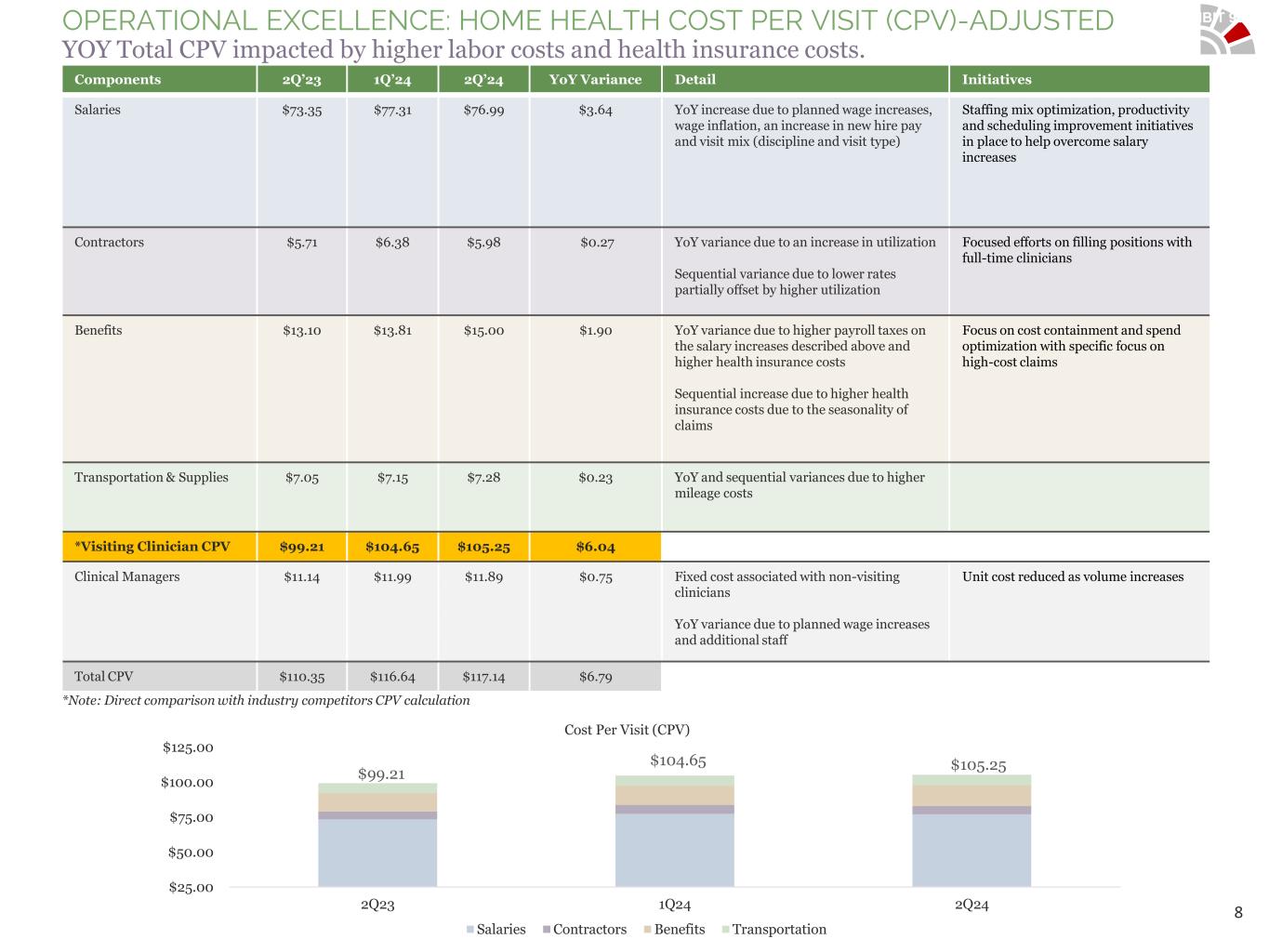 7 GENERAL & ADMINISTRATIVE EXPENSES – ADJUSTED (1,2) Notes: • Year over year total G&A as a percentage of revenue decreased 100 basis points • $7.3 million increase in total G&A is primarily due to planned wage increases, higher incentive compensation costs, an increase in our health insurance costs and higher legal and information technology fees partially offset by clinical optimization and reorganization initiatives • Total G&A increased ~$2 million sequentially primarily due to a seasonality driven increase in health insurance costs 1. The financial results for the three-month periods ended June 30, 2023, September 30, 2023, December 31, 2023, March 31, 2024 and June 30, 2024 are adjusted for certain items and should be considered a non-GAAP financial measure. A reconciliation of these non-GAAP financial measures is included in the corresponding 8-K detailing quarterly results for each respective reporting period. 2. Adjusted G&A expenses do not include depreciation and amortization. Impacted by raises, incentive compensation costs and health insurance costs 34.1% 34.4% 34.5% 33.8% 33.1% 32.0% 34.0% 36.0% 2Q23 3Q23 4Q23 1Q24 2Q24 Total G&A as a Percent of Revenue G&A as a Percent of Revenue $ in Millions 2Q23 3Q23 4Q23 1Q24 2Q24 Home Health Segment - Total 90.1$ 91.3$ 92.7$ 91.0$ 92.4$ % of HH Revenue 25.8% 26.0% 25.8% 25.0% 24.5% Hospice Segment - Total 47.9 48.4 48.6 48.0 48.7 % of HSP Revenue 24.0% 24.2% 23.6% 23.9% 23.9% High Acuity Care Segment - Total 5.2 5.2 5.4 5.9 5.4 % of HAC Revenue 131.1% 119.2% 91.4% 92.5% 55.1% Total Corporate Expenses 45.2 46.2 50.3 48.4 49.2 % of Total Revenue 8.2% 8.3% 8.8% 8.5% 8.3% Total 188.4$ 191.1$ 197.0$ 193.3$ 195.7$ % of Total Revenue 34.1% 34.4% 34.5% 33.8% 33.1% 2Q23 3Q23 4Q23 1Q24 2Q24 Salary and Benefits 26.5 27.7 29.4 27.6 27.4 Other 15.1 14.9 16.9 16.6 17.4 Corp. G&A Subtotal 41.6 42.6 46.3 44.2 44.8 Non-cash comp 3.6 3.6 4.0 4.2 4.4 Adjusted Corporate G&A 45.2 46.2 50.3 48.4 49.2 EXHIBIT 99.2
