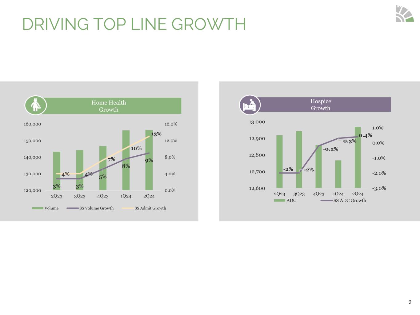 8 $25.00 $50.00 $75.00 $100.00 $125.00 2Q23 1Q24 2Q24 Cost Per Visit (CPV) Salaries Contractors Benefits Transportation OPERATIONAL EXCELLENCE: HOME HEALTH COST PER VISIT (CPV)-ADJUSTED YOY Total CPV impacted by higher labor costs and health insurance costs. *Note: Direct comparison with industry competitors CPV calculation $99.21 $104.65 $105.25 Components 2Q’23 1Q’24 2Q’24 YoY Variance Detail Initiatives Salaries $73.35 $77.31 $76.99 $3.64 YoY increase due to planned wage increases, wage inflation, an increase in new hire pay and visit mix (discipline and visit type) Staffing mix optimization, productivity and scheduling improvement initiatives in place to help overcome salary increases Contractors $5.71 $6.38 $5.98 $0.27 YoY variance due to an increase in utilization Sequential variance due to lower rates partially offset by higher utilization Focused efforts on filling positions with full-time clinicians Benefits $13.10 $13.81 $15.00 $1.90 YoY variance due to higher payroll taxes on the salary increases described above and higher health insurance costs Sequential increase due to higher health insurance costs due to the seasonality of claims Focus on cost containment and spend optimization with specific focus on high-cost claims Transportation & Supplies $7.05 $7.15 $7.28 $0.23 YoY and sequential variances due to higher mileage costs *Visiting Clinician CPV $99.21 $104.65 $105.25 $6.04 Clinical Managers $11.14 $11.99 $11.89 $0.75 Fixed cost associated with non-visiting clinicians YoY variance due to planned wage increases and additional staff Unit cost reduced as volume increases Total CPV $110.35 $116.64 $117.14 $6.79 EXHIBIT 99.2