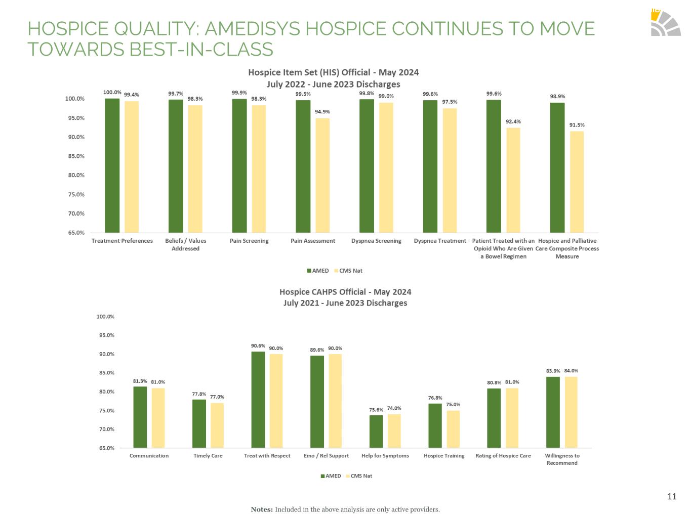 10 INDUSTRY LEADING QUALITY SCORES Quality of Patient Care (QPC) Patient Satisfaction (PS) • Amedisys maintains a 4-Star average in the Jul 2024 HHC Final release with 93% of our providers (representing 92% of care centers) at 4+ Stars and 59% of our providers (representing 60% of care centers) at 4.5+ Stars. •21 Amedisys providers (representing 40 care centers) rated at 5 Stars. Notes: (1) Jul 2024 QPC Star Final performance period = Oct 2022 – Sep 2023 (ACH = CY 2022). (2) Jul 2024 PS Final performance period = Jan 2023 – Dec 2023. (3) QPC Star and PS Results for Amedisys Legacy providers only. (4) Only currently active care centers included in care center results. 3.00 3.50 4.00 4.50 Jan 2022 Apr 2022 Jul 2022 Oct 2022 Jan 2023 Apr 2023 Jul 2023 Oct 2023 Jan 2024 Apr 2024 Jul 2024 PS Industry Performance Amedisys PS Industry Avg PS Top Competitor 3.00 3.50 4.00 4.50 Jan 2022 Apr 2022 Jul 2022 Oct 2022 Jan 2023 Apr 2023 Jul 2023 Oct 2023 Jan 2024 Apr 2024 Jul 2024 QPC Industry Performance Amedisys QPC Industry Avg QPC Top Competitor Metric Oct 23 Release Jan 24 Release Apr 24 Final Jul 24 Final Quality of Patient Care 4.44 4.41 4.35 4.32 Entities at 4+ Stars 98% 96% 95% 93% Metric Oct 23 Release Jan 24 Release Apr 24 Final July 24 Final Patient Satisfaction Star 3.73 3.61 3.72 3.77 Performance Over Industry +2% +3% +2% +3% EXHIBIT 99.2