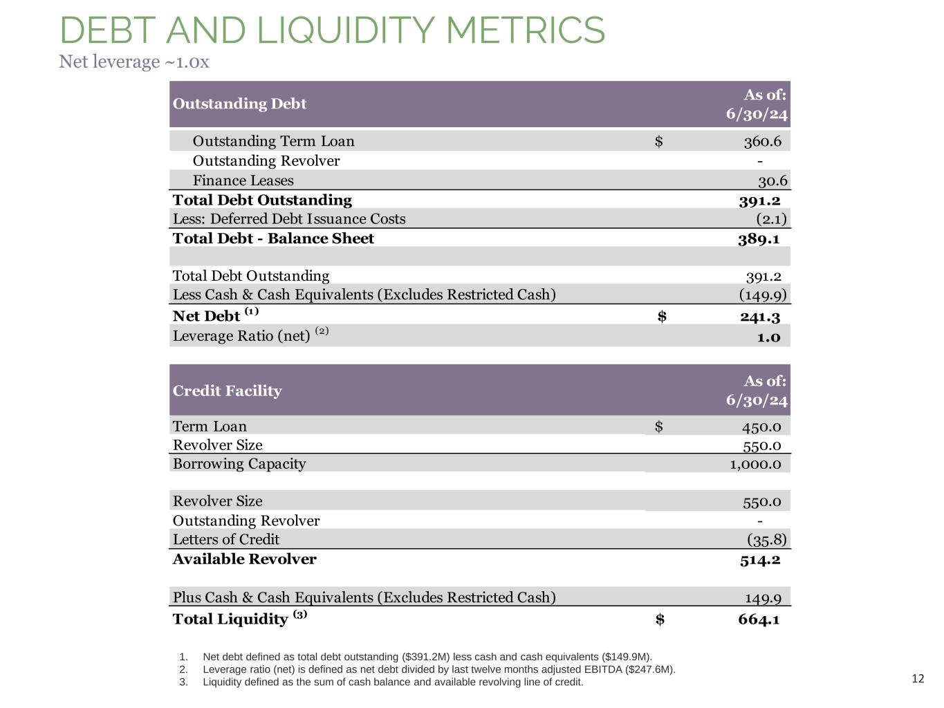 12 DEBT AND LIQUIDITY METRICS Net leverage ~1.0x 1. Net debt defined as total debt outstanding ($391.2M) less cash and cash equivalents ($149.9M). 2. Leverage ratio (net) is defined as net debt divided by last twelve months adjusted EBITDA ($247.6M). 3. Liquidity defined as the sum of cash balance and available revolving line of credit. Outstanding Term Loan 360.6$ Outstanding Revolver - Finance Leases 30.6 Total Debt Outstanding 391.2 Less: Deferred Debt Issuance Costs (2.1) Total Debt - Balance Sheet 389.1 Total Debt Outstanding 391.2 Less Cash & Cash Equivalents (Excludes Restricted Cash) (149.9) Net Debt (1) 241.3$ Leverage Ratio (net) (2) 1.0 Term Loan 450.0$ Revolver Size 550.0 Borrowing Capacity 1,000.0 Revolver Size 550.0 Outstanding Revolver - Letters of Credit (35.8) Available Revolver 514.2 Plus Cash & Cash Equivalents (Excludes Restricted Cash) 149.9 Total Liquidity (3) 664.1$ As of: 6/30/24 Credit Facility Outstanding Debt As of: 6/30/24 EXHIBIT 99.2