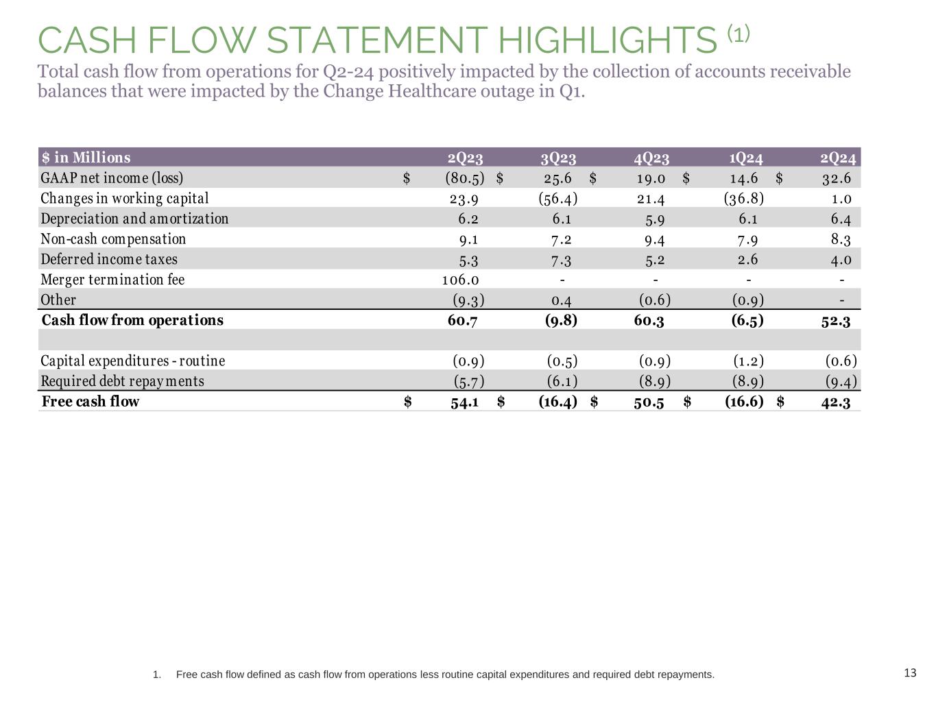 13 CASH FLOW STATEMENT HIGHLIGHTS (1) Total cash flow from operations for Q2-24 positively impacted by the collection of accounts receivable balances that were impacted by the Change Healthcare outage in Q1. 1. Free cash flow defined as cash flow from operations less routine capital expenditures and required debt repayments. $ in Millions 2Q23 3Q23 4Q23 1Q24 2Q24 GAAP net income (loss) (80.5)$ 25.6$ 1 9.0$ 1 4.6$ 32.6$ Changes in working capital 23.9 (56.4) 21 .4 (36.8) 1 .0 Depreciation and amortization 6.2 6.1 5.9 6.1 6.4 Non-cash compensation 9.1 7 .2 9.4 7 .9 8.3 Deferred income taxes 5.3 7 .3 5.2 2 .6 4.0 Merger termination fee 1 06.0 - - - - Other (9.3) 0.4 (0.6) (0.9) - Cash flow from operations 60.7 (9.8) 60.3 (6.5) 52.3 Capital expenditures - routine (0.9) (0.5) (0.9) (1 .2) (0.6) Required debt repay ments (5.7 ) (6.1 ) (8.9) (8.9) (9.4) Free cash flow 54.1$ (16.4)$ 50.5$ (16.6)$ 42.3$ EXHIBIT 99.2