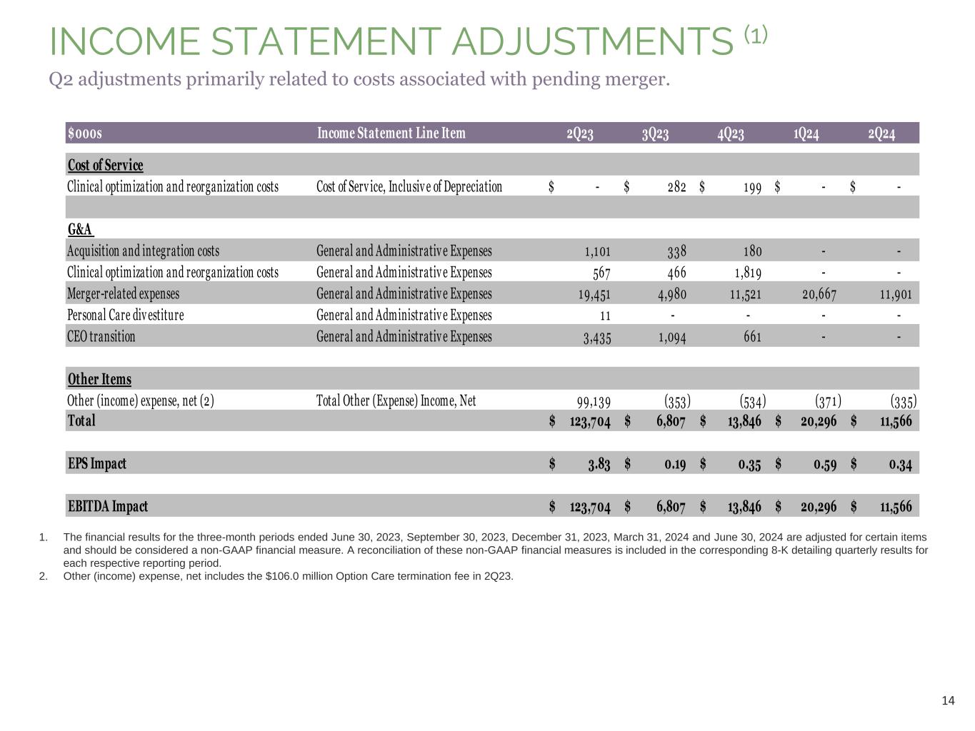 14 INCOME STATEMENT ADJUSTMENTS (1) 1. The financial results for the three-month periods ended June 30, 2023, September 30, 2023, December 31, 2023, March 31, 2024 and June 30, 2024 are adjusted for certain items and should be considered a non-GAAP financial measure. A reconciliation of these non-GAAP financial measures is included in the corresponding 8-K detailing quarterly results for each respective reporting period. 2. Other (income) expense, net includes the $106.0 million Option Care termination fee in 2Q23. Q2 adjustments primarily related to costs associated with pending merger. $000s Income Statement Line Item 2Q23 3Q23 4Q23 1Q24 2Q24 Cost of Service Clinical optimization and reorganization costs Cost of Serv ice, Inclusiv e of Depreciation -$ 282$ 1 99$ -$ -$ G&A Acquisition and integration costs General and Administrativ e Expenses 1 ,1 01 338 1 80 - - Clinical optimization and reorganization costs General and Administrativ e Expenses 567 466 1 ,81 9 - - Merger-related expenses General and Administrativ e Expenses 1 9,451 4,980 1 1 ,521 20,667 1 1 ,901 Personal Care div estiture General and Administrativ e Expenses 1 1 - - - - CEO transition General and Administrativ e Expenses 3,435 1 ,094 661 - - Other Items Other (income) expense, net (2) Total Other (Expense) Income, Net 99,1 39 (353) (534) (37 1 ) (335) Total 123,704$ 6,807$ 13,846$ 20,296$ 11,566$ EPS Impact 3.83$ 0.19$ 0.35$ 0.59$ 0.34$ EBITDA Impact 123,704$ 6,807$ 13,846$ 20,296$ 11,566$ EXHIBIT 99.2