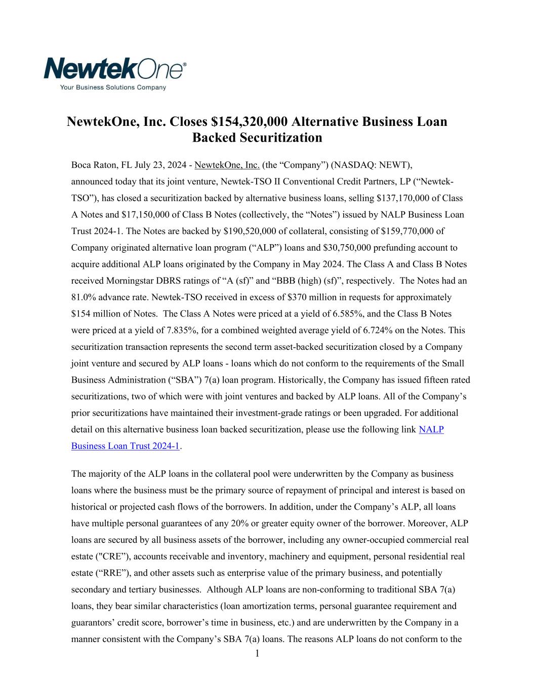 1 NewtekOne, Inc. Closes $154,320,000 Alternative Business Loan Backed Securitization Boca Raton, FL July 23, 2024 - NewtekOne, Inc. (the “Company”) (NASDAQ: NEWT), announced today that its joint venture, Newtek-TSO II Conventional Credit Partners, LP (“Newtek- TSO”), has closed a securitization backed by alternative business loans, selling $137,170,000 of Class A Notes and $17,150,000 of Class B Notes (collectively, the “Notes”) issued by NALP Business Loan Trust 2024-1. The Notes are backed by $190,520,000 of collateral, consisting of $159,770,000 of Company originated alternative loan program (“ALP”) loans and $30,750,000 prefunding account to acquire additional ALP loans originated by the Company in May 2024. The Class A and Class B Notes received Morningstar DBRS ratings of “A (sf)” and “BBB (high) (sf)”, respectively. The Notes had an 81.0% advance rate. Newtek-TSO received in excess of $370 million in requests for approximately $154 million of Notes. The Class A Notes were priced at a yield of 6.585%, and the Class B Notes were priced at a yield of 7.835%, for a combined weighted average yield of 6.724% on the Notes. This securitization transaction represents the second term asset-backed securitization closed by a Company joint venture and secured by ALP loans - loans which do not conform to the requirements of the Small Business Administration (“SBA”) 7(a) loan program. Historically, the Company has issued fifteen rated securitizations, two of which were with joint ventures and backed by ALP loans. All of the Company’s prior securitizations have maintained their investment-grade ratings or been upgraded. For additional detail on this alternative business loan backed securitization, please use the following link NALP Business Loan Trust 2024-1. The majority of the ALP loans in the collateral pool were underwritten by the Company as business loans where the business must be the primary source of repayment of principal and interest is based on historical or projected cash flows of the borrowers. In addition, under the Company’s ALP, all loans have multiple personal guarantees of any 20% or greater equity owner of the borrower. Moreover, ALP loans are secured by all business assets of the borrower, including any owner-occupied commercial real estate ("CRE”), accounts receivable and inventory, machinery and equipment, personal residential real estate (“RRE”), and other assets such as enterprise value of the primary business, and potentially secondary and tertiary businesses. Although ALP loans are non-conforming to traditional SBA 7(a) loans, they bear similar characteristics (loan amortization terms, personal guarantee requirement and guarantors’ credit score, borrower’s time in business, etc.) and are underwritten by the Company in a manner consistent with the Company’s SBA 7(a) loans. The reasons ALP loans do not conform to the