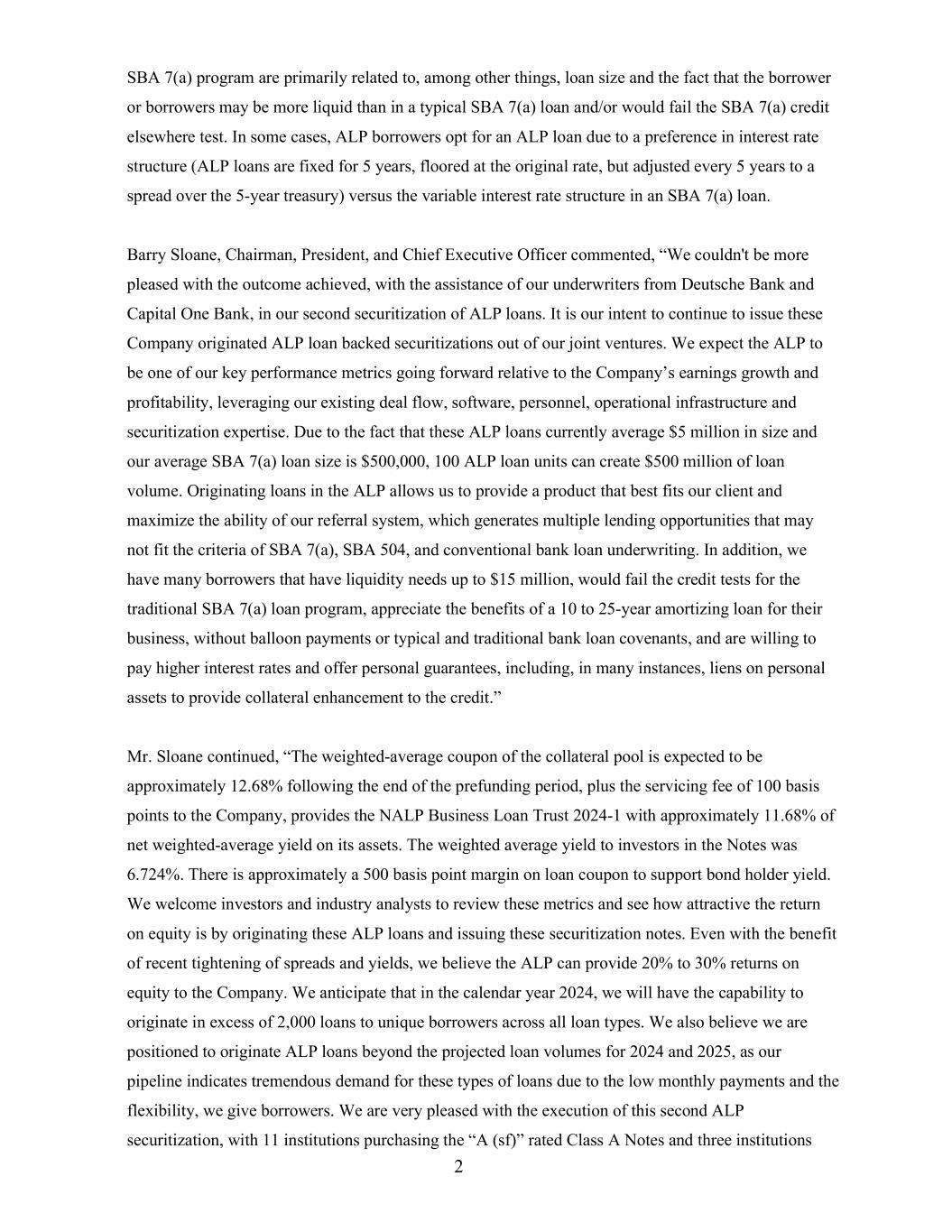 2 SBA 7(a) program are primarily related to, among other things, loan size and the fact that the borrower or borrowers may be more liquid than in a typical SBA 7(a) loan and/or would fail the SBA 7(a) credit elsewhere test. In some cases, ALP borrowers opt for an ALP loan due to a preference in interest rate structure (ALP loans are fixed for 5 years, floored at the original rate, but adjusted every 5 years to a spread over the 5-year treasury) versus the variable interest rate structure in an SBA 7(a) loan. Barry Sloane, Chairman, President, and Chief Executive Officer commented, “We couldn't be more pleased with the outcome achieved, with the assistance of our underwriters from Deutsche Bank and Capital One Bank, in our second securitization of ALP loans. It is our intent to continue to issue these Company originated ALP loan backed securitizations out of our joint ventures. We expect the ALP to be one of our key performance metrics going forward relative to the Company’s earnings growth and profitability, leveraging our existing deal flow, software, personnel, operational infrastructure and securitization expertise. Due to the fact that these ALP loans currently average $5 million in size and our average SBA 7(a) loan size is $500,000, 100 ALP loan units can create $500 million of loan volume. Originating loans in the ALP allows us to provide a product that best fits our client and maximize the ability of our referral system, which generates multiple lending opportunities that may not fit the criteria of SBA 7(a), SBA 504, and conventional bank loan underwriting. In addition, we have many borrowers that have liquidity needs up to $15 million, would fail the credit tests for the traditional SBA 7(a) loan program, appreciate the benefits of a 10 to 25-year amortizing loan for their business, without balloon payments or typical and traditional bank loan covenants, and are willing to pay higher interest rates and offer personal guarantees, including, in many instances, liens on personal assets to provide collateral enhancement to the credit.” Mr. Sloane continued, “The weighted-average coupon of the collateral pool is expected to be approximately 12.68% following the end of the prefunding period, plus the servicing fee of 100 basis points to the Company, provides the NALP Business Loan Trust 2024-1 with approximately 11.68% of net weighted-average yield on its assets. The weighted average yield to investors in the Notes was 6.724%. There is approximately a 500 basis point margin on loan coupon to support bond holder yield. We welcome investors and industry analysts to review these metrics and see how attractive the return on equity is by originating these ALP loans and issuing these securitization notes. Even with the benefit of recent tightening of spreads and yields, we believe the ALP can provide 20% to 30% returns on equity to the Company. We anticipate that in the calendar year 2024, we will have the capability to originate in excess of 2,000 loans to unique borrowers across all loan types. We also believe we are positioned to originate ALP loans beyond the projected loan volumes for 2024 and 2025, as our pipeline indicates tremendous demand for these types of loans due to the low monthly payments and the flexibility, we give borrowers. We are very pleased with the execution of this second ALP securitization, with 11 institutions purchasing the “A (sf)” rated Class A Notes and three institutions