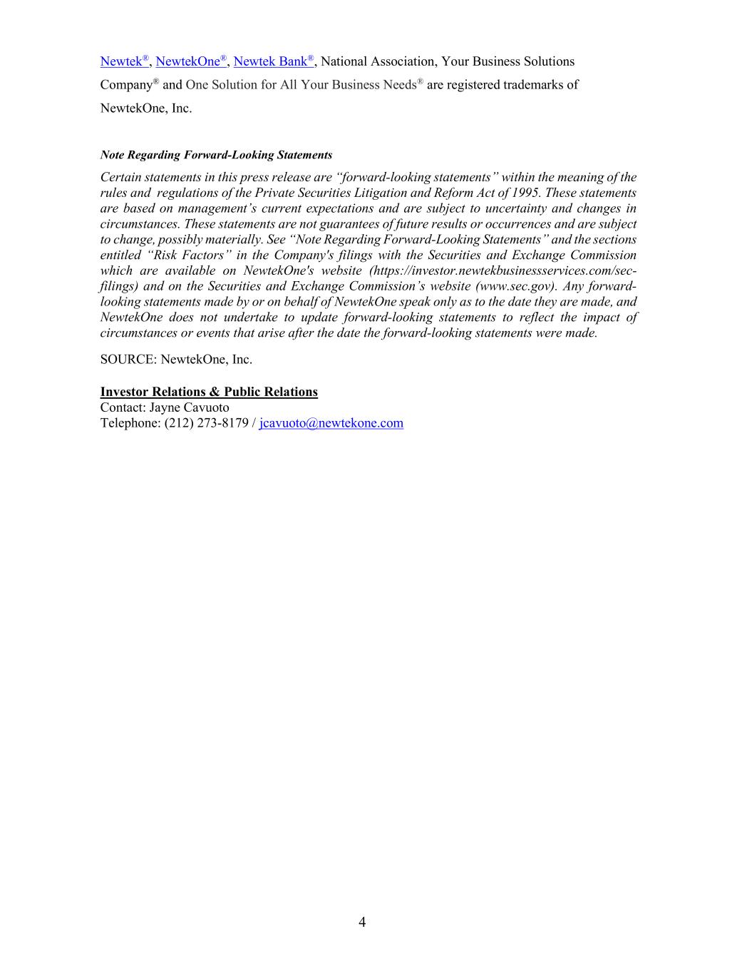 4 Newtek®, NewtekOne®, Newtek Bank®, National Association, Your Business Solutions Company® and One Solution for All Your Business Needs® are registered trademarks of NewtekOne, Inc. Note Regarding Forward-Looking Statements Certain statements in this press release are “forward-looking statements” within the meaning of the rules and regulations of the Private Securities Litigation and Reform Act of 1995. These statements are based on management’s current expectations and are subject to uncertainty and changes in circumstances. These statements are not guarantees of future results or occurrences and are subject to change, possibly materially. See “Note Regarding Forward-Looking Statements” and the sections entitled “Risk Factors” in the Company's filings with the Securities and Exchange Commission which are available on NewtekOne's website (https://investor.newtekbusinessservices.com/sec- filings) and on the Securities and Exchange Commission’s website (www.sec.gov). Any forward- looking statements made by or on behalf of NewtekOne speak only as to the date they are made, and NewtekOne does not undertake to update forward-looking statements to reflect the impact of circumstances or events that arise after the date the forward-looking statements were made. SOURCE: NewtekOne, Inc. Investor Relations & Public Relations Contact: Jayne Cavuoto Telephone: (212) 273-8179 / jcavuoto@newtekone.com