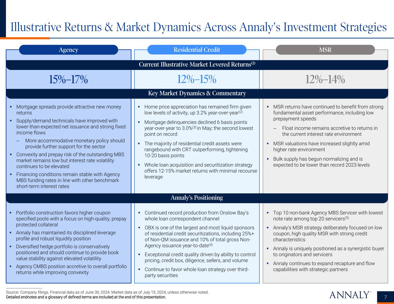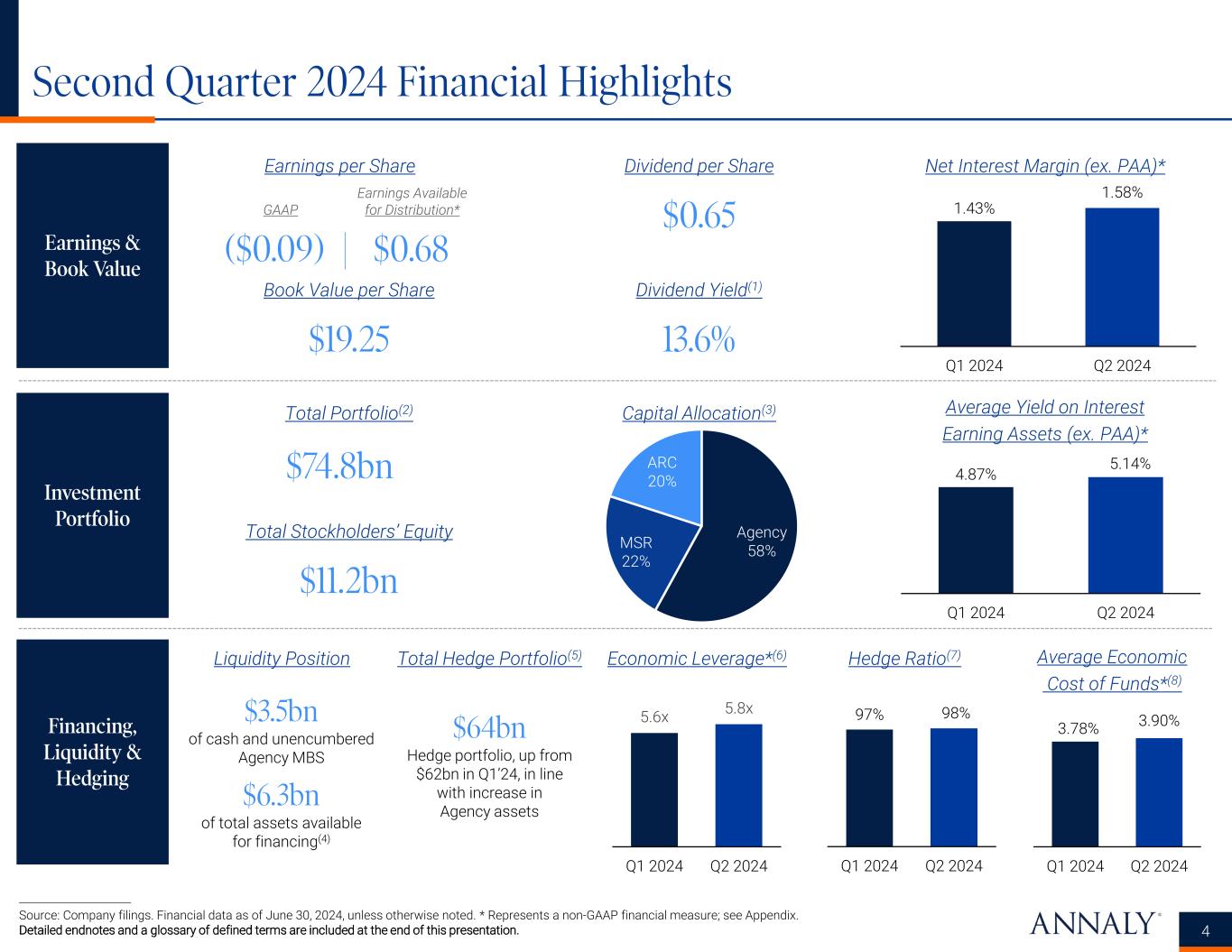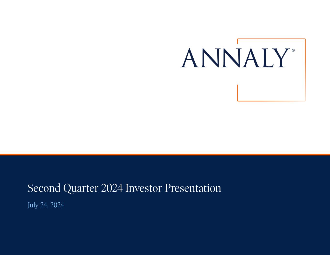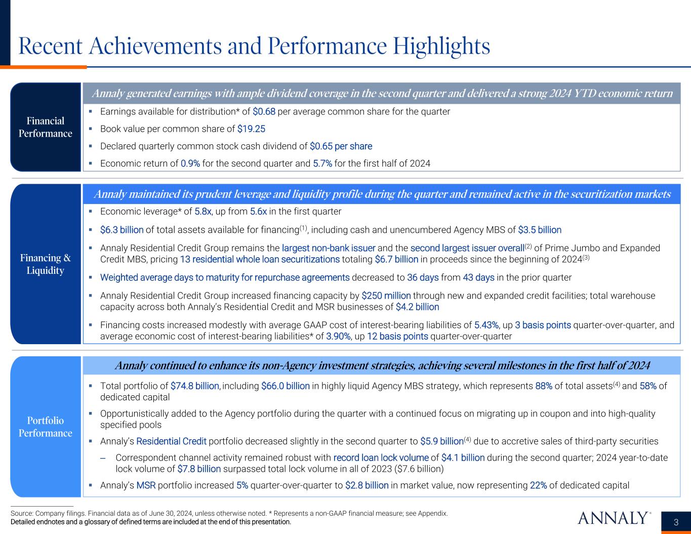 Important Notices 2 This presentation is issued by Annaly Capital Management, Inc. ("Annaly"), an internally-managed, publicly traded company that has elected to be taxed as a real estate investment trust for federal income tax purposes, and is being furnished in connection with Annaly’s Second Quarter 2024 earnings release. This presentation is provided for investors in Annaly for informational purposes only and is not an offer to sell, or a solicitation of an offer to buy, any security or instrument. Forward-Looking Statements This presentation, other written or oral communications, and our public documents to which we refer contain or incorporate by reference certain forward-looking statements which are based on various assumptions (some of which are beyond our control) and may be identified by reference to a future period or periods or by the use of forward-looking terminology, such as “may,” “will,” “believe,” “expect,” “anticipate,” “continue,” “illustrative” or similar terms or variations on those terms or the negative of those terms. Such statements include those relating to the Company’s future performance, macro outlook, the interest rate and credit environments, tax reform and future opportunities. Actual results could differ materially from those set forth in forward-looking statements due to a variety of factors, including, but not limited to, changes in interest rates; changes in the yield curve; changes in prepayment rates; the availability of mortgage-backed securities (“MBS”) and other securities for purchase; the availability of financing and, if available, the terms of any financing; changes in the market value of the Company’s assets; changes in business conditions and the general economy; the Company’s ability to grow its residential credit business; the Company's ability to grow its mortgage servicing rights business; credit risks related to the Company’s investments in credit risk transfer securities and residential mortgage-backed securities and related residential mortgage credit assets; risks related to investments in mortgage servicing rights; the Company’s ability to consummate any contemplated investment opportunities; changes in government regulations or policy affecting the Company’s business; the Company’s ability to maintain its qualification as a REIT for U.S. federal income tax purposes; the Company’s ability to maintain its exemption from registration under the Investment Company Act of 1940; and operational risks or risk management failures by us or critical third parties, including cybersecurity incidents. For a discussion of the risks and uncertainties which could cause actual results to differ from those contained in the forward-looking statements, see “Risk Factors” in our most recent Annual Report on Form 10-K and any subsequent Quarterly Reports on Form 10-Q. The Company does not undertake, and specifically disclaims any obligation, to publicly release the result of any revisions which may be made to any forward-looking statements to reflect the occurrence of anticipated or unanticipated events or circumstances after the date of such statements, except as required by law. We use our website (www.annaly.com) and LinkedIn account (www.linkedin.com/company/annaly-capital-management) as channels of distribution of company information. The information we post through these channels may be deemed material. Accordingly, investors should monitor these channels, in addition to following our press releases, SEC filings and public conference calls and webcasts. In addition, you may automatically receive email alerts and other information about Annaly when you enroll your email address by visiting the "Investors" section of our website, then clicking on "Investor Resources" and selecting "Email Alerts" to complete the email notification form. Our website, any alerts and social media channels are not incorporated into this document. Past performance is no guarantee of future results. There is no guarantee that any investment strategy referenced herein will work under all market conditions. There is no guarantee that illustrative returns will occur. Prior to making any investment decision, you should evaluate your ability to invest for the long-term, especially during periods of downturns in the market. You alone assume the responsibility of evaluating the merits and risks associated with any potential investment or investment strategy referenced herein. To the extent that this material contains reference to any past specific investment recommendations or strategies which were or would have been profitable to any person, it should not be assumed that recommendations made in the future will be profitable or will equal the performance of such past investment recommendations or strategies. The information contained herein is not intended to provide, and should not be relied upon for accounting, legal or tax advice or investment recommendations for Annaly or any of its affiliates. Regardless of source, information is believed to be reliable for purposes used herein, but Annaly makes no representation or warranty as to the accuracy or completeness thereof and does not take any responsibility for information obtained from sources outside of Annaly. Certain information contained in the presentation discusses general market activity, industry or sector trends, or other broad-based economic, market or political conditions and should not be construed as research or investment advice. Non-GAAP Financial Measures This presentation includes certain non-GAAP financial measures, including earnings available for distribution. We believe the non-GAAP financial measures are useful for management, investors, analysts, and other interested parties in evaluating our performance but should not be viewed in isolation and are not a substitute for financial measures computed in accordance with U.S. generally accepted accounting pr