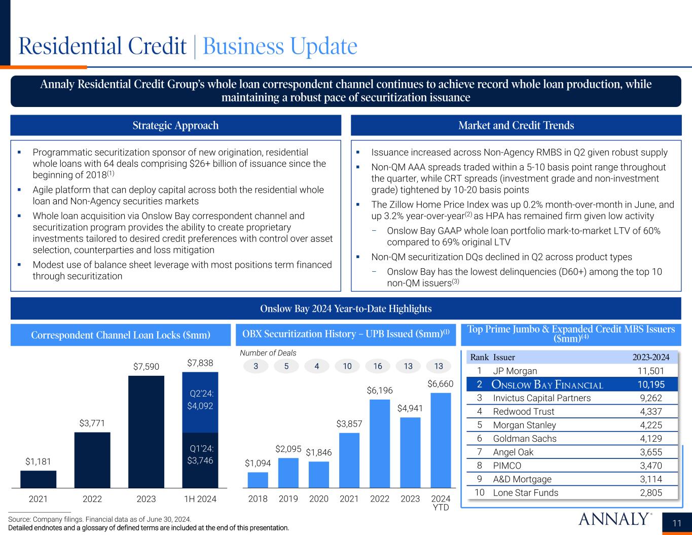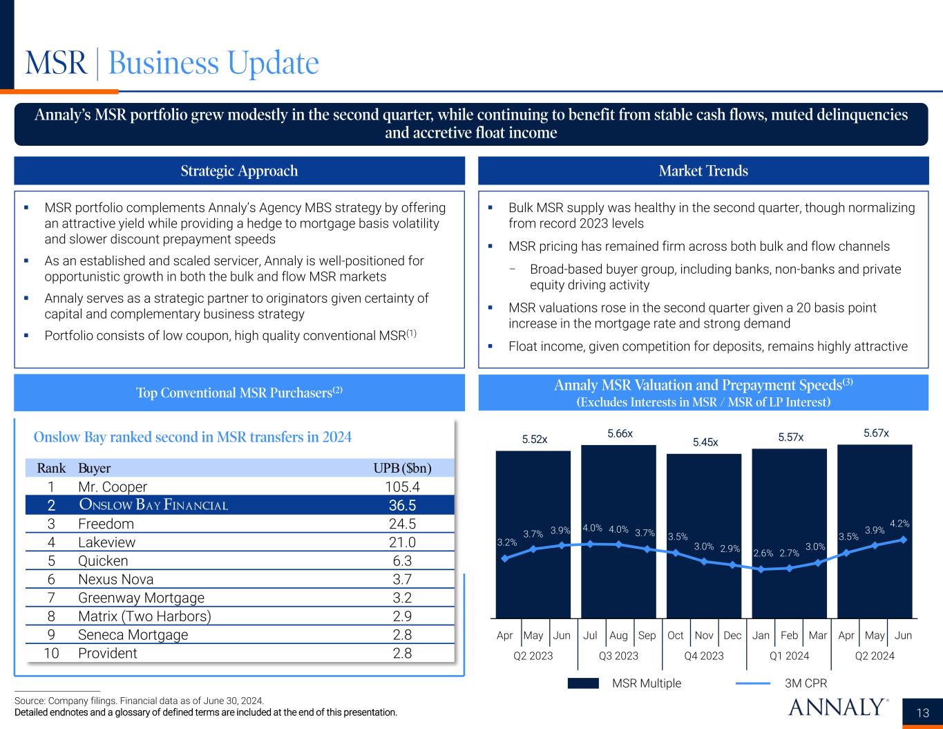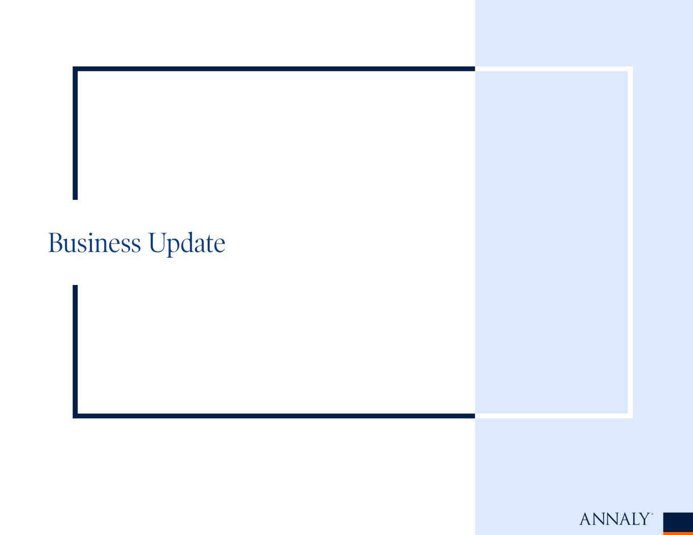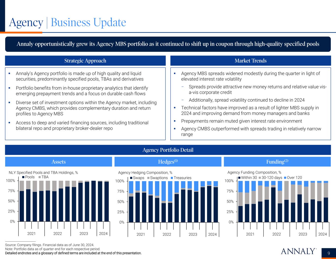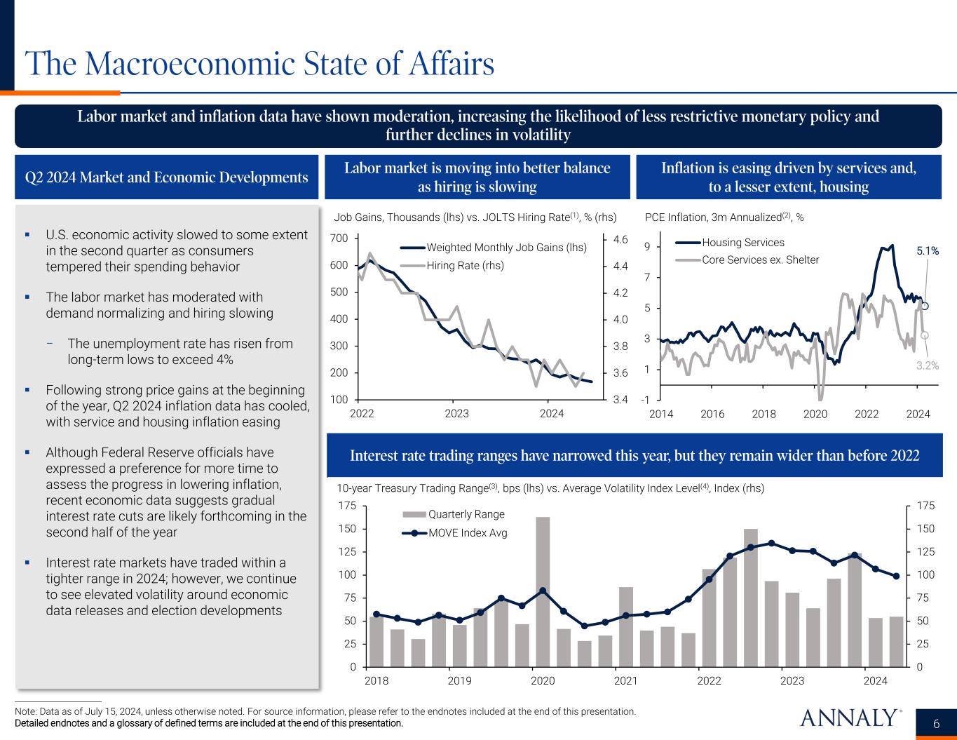 Important Notices 2 This presentation is issued by Annaly Capital Management, Inc. ("Annaly"), an internally-managed, publicly traded company that has elected to be taxed as a real estate investment trust for federal income tax purposes, and is being furnished in connection with Annaly’s Second Quarter 2024 earnings release. This presentation is provided for investors in Annaly for informational purposes only and is not an offer to sell, or a solicitation of an offer to buy, any security or instrument. Forward-Looking Statements This presentation, other written or oral communications, and our public documents to which we refer contain or incorporate by reference certain forward-looking statements which are based on various assumptions (some of which are beyond our control) and may be identified by reference to a future period or periods or by the use of forward-looking terminology, such as “may,” “will,” “believe,” “expect,” “anticipate,” “continue,” “illustrative” or similar terms or variations on those terms or the negative of those terms. Such statements include those relating to the Company’s future performance, macro outlook, the interest rate and credit environments, tax reform and future opportunities. Actual results could differ materially from those set forth in forward-looking statements due to a variety of factors, including, but not limited to, changes in interest rates; changes in the yield curve; changes in prepayment rates; the availability of mortgage-backed securities (“MBS”) and other securities for purchase; the availability of financing and, if available, the terms of any financing; changes in the market value of the Company’s assets; changes in business conditions and the general economy; the Company’s ability to grow its residential credit business; the Company's ability to grow its mortgage servicing rights business; credit risks related to the Company’s investments in credit risk transfer securities and residential mortgage-backed securities and related residential mortgage credit assets; risks related to investments in mortgage servicing rights; the Company’s ability to consummate any contemplated investment opportunities; changes in government regulations or policy affecting the Company’s business; the Company’s ability to maintain its qualification as a REIT for U.S. federal income tax purposes; the Company’s ability to maintain its exemption from registration under the Investment Company Act of 1940; and operational risks or risk management failures by us or critical third parties, including cybersecurity incidents. For a discussion of the risks and uncertainties which could cause actual results to differ from those contained in the forward-looking statements, see “Risk Factors” in our most recent Annual Report on Form 10-K and any subsequent Quarterly Reports on Form 10-Q. The Company does not undertake, and specifically disclaims any obligation, to publicly release the result of any revisions which may be made to any forward-looking statements to reflect the occurrence of anticipated or unanticipated events or circumstances after the date of such statements, except as required by law. We use our website (www.annaly.com) and LinkedIn account (www.linkedin.com/company/annaly-capital-management) as channels of distribution of company information. The information we post through these channels may be deemed material. Accordingly, investors should monitor these channels, in addition to following our press releases, SEC filings and public conference calls and webcasts. In addition, you may automatically receive email alerts and other information about Annaly when you enroll your email address by visiting the "Investors" section of our website, then clicking on "Investor Resources" and selecting "Email Alerts" to complete the email notification form. Our website, any alerts and social media channels are not incorporated into this document. Past performance is no guarantee of future results. There is no guarantee that any investment strategy referenced herein will work under all market conditions. There is no guarantee that illustrative returns will occur. Prior to making any investment decision, you should evaluate your ability to invest for the long-term, especially during periods of downturns in the market. You alone assume the responsibility of evaluating the merits and risks associated with any potential investment or investment strategy referenced herein. To the extent that this material contains reference to any past specific investment recommendations or strategies which were or would have been profitable to any person, it should not be assumed that recommendations made in the future will be profitable or will equal the performance of such past investment recommendations or strategies. The information contained herein is not intended to provide, and should not be relied upon for accounting, legal or tax advice or investment recommendations for Annaly or any of its affiliates. Regardless of source, information is believed to be reliable for purposes used herein, but Annaly makes no representation or warranty as to the accuracy or completeness thereof and does not take any responsibility for information obtained from sources outside of Annaly. Certain information contained in the presentation discusses general market activity, industry or sector trends, or other broad-based economic, market or political conditions and should not be construed as research or investment advice. Non-GAAP Financial Measures This presentation includes certain non-GAAP financial measures, including earnings available for distribution. We believe the non-GAAP financial measures are useful for management, investors, analysts, and other interested parties in evaluating our performance but should not be viewed in isolation and are not a substitute for financial measures computed in accordance with U.S. generally accepted accounting pr