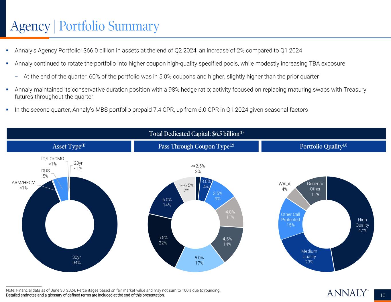 Agency | Business Update Annaly opportunistically grew its Agency MBS portfolio as it continued to shift up in coupon through high-quality specified pools 9 Annaly’s Agency portfolio is made up of high quality and liquid securities, predominantly specified pools, TBAs and derivatives Portfolio benefits from in-house proprietary analytics that identify emerging prepayment trends and a focus on durable cash flows Diverse set of investment options within the Agency market, including Agency CMBS, which provides complementary duration and return profiles to Agency MBS Access to deep and varied financing sources, including traditional bilateral repo and proprietary broker-dealer repo Agency MBS spreads widened modestly during the quarter in light of elevated interest rate volatility − Spreads provide attractive new money returns and relative value vis- a-vis corporate credit − Additionally, spread volatility continued to decline in 2024 Technical factors have improved as a result of lighter MBS supply in 2024 and improving demand from money managers and banks Prepayments remain muted given interest rate environment Agency CMBS outperformed with spreads trading in relatively narrow range Source: Company filings. Financial data as of June 30, 2024. Note: Portfolio data as of quarter end for each respective period. Detailed endnotes and a glossary of defined terms are included at the end of this presentation. ‘ ‘ ‘ Strategic Approach Market Trends Agency Portfolio Detail Assets Hedges(1) Funding(2) 0% 25% 50% 75% 100% 2021 2022 2023 2024 Pools TBA NLY Specified Pools and TBA Holdings, % 0% 25% 50% 75% 100% 2021 2022 2023 2024 Swaps Swaptions Treasuries Agency Hedging Composition, % 0% 25% 50% 75% 100% 2021 2022 2023 2024 Within 30 30-120 days Over 120 Agency Funding Composition, %