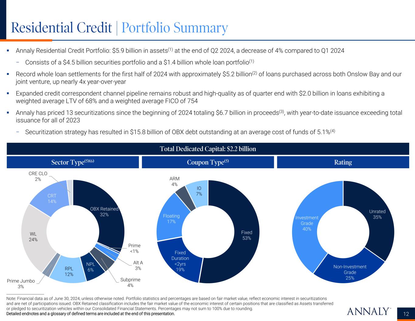 Residential Credit | Business Update Annaly Residential Credit Group’s whole loan correspondent channel continues to achieve record whole loan production, while maintaining a robust pace of securitization issuance 11 Programmatic securitization sponsor of new origination, residential whole loans with 64 deals comprising $26+ billion of issuance since the beginning of 2018(1) Agile platform that can deploy capital across both the residential whole loan and Non-Agency securities markets Whole loan acquisition via Onslow Bay correspondent channel and securitization program provides the ability to create proprietary investments tailored to desired credit preferences with control over asset selection, counterparties and loss mitigation Modest use of balance sheet leverage with most positions term financed through securitization Issuance increased across Non-Agency RMBS in Q2 given robust supply Non-QM AAA spreads traded within a 5-10 basis point range throughout the quarter, while CRT spreads (investment grade and non-investment grade) tightened by 10-20 basis points The Zillow Home Price Index was up 0.2% month-over-month in June, and up 3.2% year-over-year(2) as HPA has remained firm given low activity − Onslow Bay GAAP whole loan portfolio mark-to-market LTV of 60% compared to 69% original LTV Non-QM securitization DQs declined in Q2 across product types − Onslow Bay has the lowest delinquencies (D60+) among the top 10 non-QM issuers(3) Source: Company filings. Financial data as of June 30, 2024. Detailed endnotes and a glossary of defined terms are included at the end of this presentation. Strategic Approach Market and Credit Trends Onslow Bay 2024 Year-to-Date Highlights Correspondent Channel Loan Locks ($mm) OBX Securitization History – UPB Issued ($mm)(1) Top Prime Jumbo & Expanded Credit MBS Issuers ($mm)(4) 3 5 4 10 16 13 13 Number of Deals Rank Issuer 2023-2024 1 JP Morgan 11,501 2 10,195 3 Invictus Capital Partners 9,262 4 Redwood Trust 4,337 5 Morgan Stanley 4,225 6 Goldman Sachs 4,129 7 Angel Oak 3,655 8 PIMCO 3,470 9 A&D Mortgage 3,114 10 Lone Star Funds 2,805 YTD $3,746 $4,092 $1,181 $3,771 $7,590 $7,838 2021 2022 2023 1H 2024 Q2'24: Q1'24: $1,094 $2,095 $1,846 $3,857 $6,196 $4,941 $6,660 2018 2019 2020 2021 2022 2023 2024