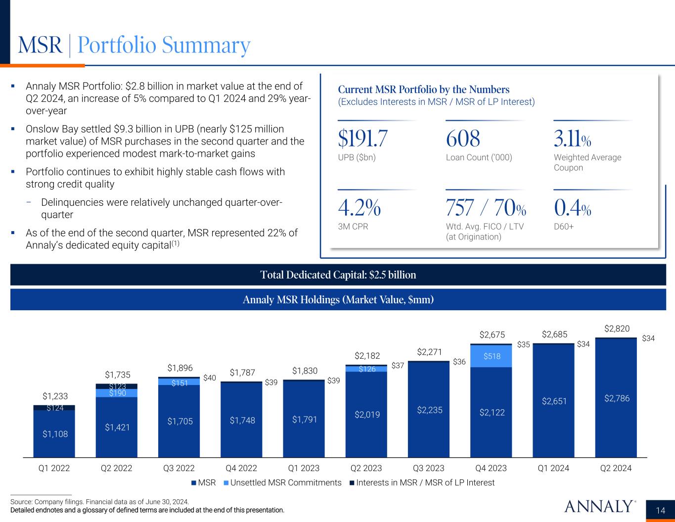 MSR | Business Update 13 Source: Company filings. Financial data as of June 30, 2024. Detailed endnotes and a glossary of defined terms are included at the end of this presentation. Annaly’s MSR portfolio grew modestly in the second quarter, while continuing to benefit from stable cash flows, muted delinquencies and accretive float income MSR portfolio complements Annaly’s Agency MBS strategy by offering an attractive yield while providing a hedge to mortgage basis volatility and slower discount prepayment speeds As an established and scaled servicer, Annaly is well-positioned for opportunistic growth in both the bulk and flow MSR markets Annaly serves as a strategic partner to originators given certainty of capital and complementary business strategy Portfolio consists of low coupon, high quality conventional MSR(1) Bulk MSR supply was healthy in the second quarter, though normalizing from record 2023 levels MSR pricing has remained firm across both bulk and flow channels − Broad-based buyer group, including banks, non-banks and private equity driving activity MSR valuations rose in the second quarter given a 20 basis point increase in the mortgage rate and strong demand Float income, given competition for deposits, remains highly attractive Strategic Approach Market Trends Annaly MSR Valuation and Prepayment Speeds(3) (Excludes Interests in MSR / MSR of LP Interest) MSR Multiple 3M CPR Top Conventional MSR Purchasers(2) Rank Buyer UPB ($bn) 1 Mr. Cooper 105.4 2 36.5 3 Freedom 24.5 4 Lakeview 21.0 5 Quicken 6.3 6 Nexus Nova 3.7 7 Greenway Mortgage 3.2 8 Matrix (Two Harbors) 2.9 9 Seneca Mortgage 2.8 10 Provident 2.8 Onslow Bay ranked second in MSR transfers in 2024 5.52x 5.66x 5.45x 5.57x 5.67x 3.2% 3.7% 3.9% 4.0% 4.0% 3.7% 3.5% 3.0% 2.9% 2.6% 2.7% 3.0% 3.5% 3.9% 4.2% Apr May Jun Jul Aug Sep Oct Nov Dec Jan Feb Mar Apr May Jun Q2 2023 Q3 2023 Q4 2023 Q1 2024 Q2 2024